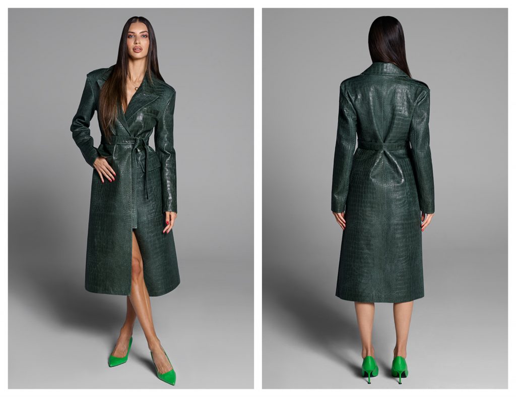 Gulerul realizat tot din piele naturală și buzunarele laterale sunt detalii care combină stilul cu funcționalitatea, oferindu-ți atât căldură, cât și un look impecabil în zilele răcoroase de toamnă. Iar cureaua din talie accentuează perfect formele feminine, creând o siluetă elegantă și sofisticată.
