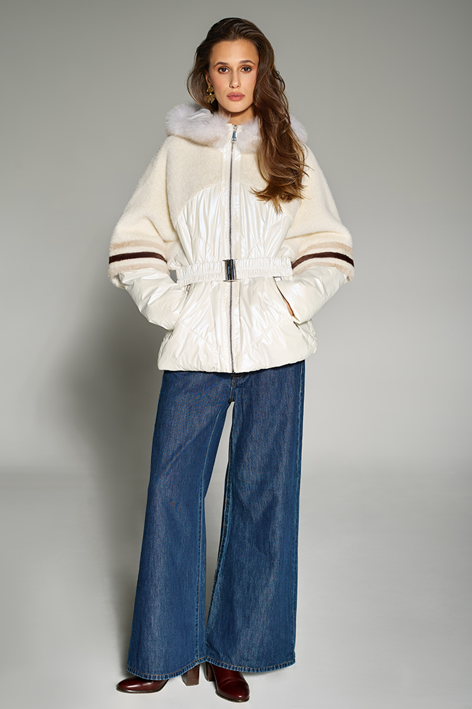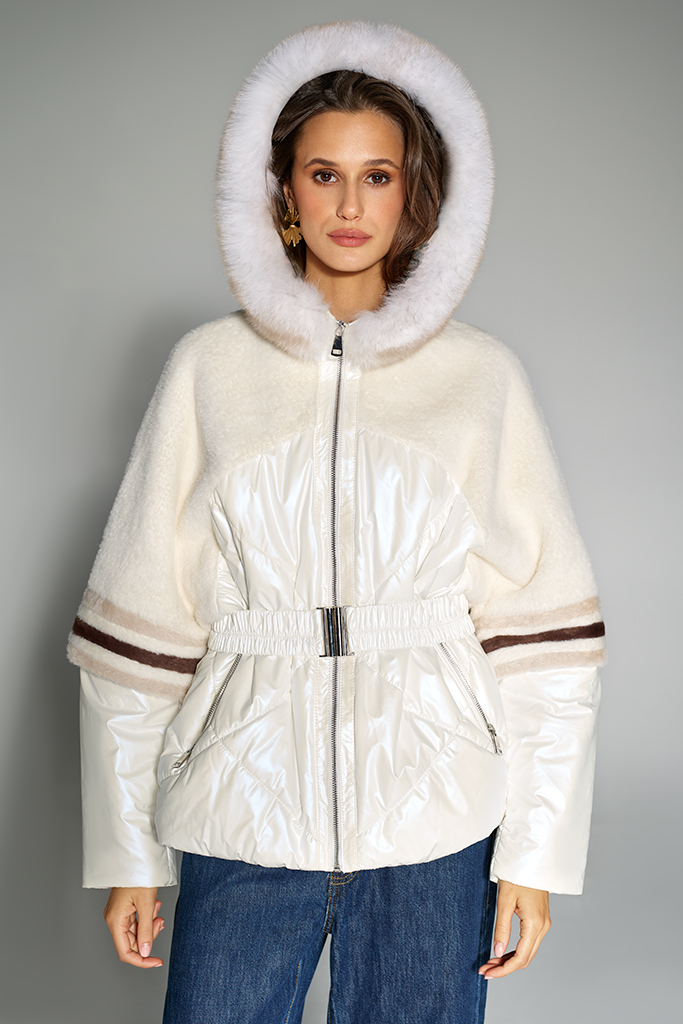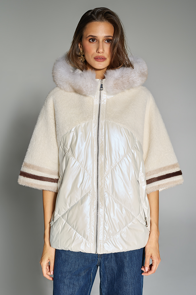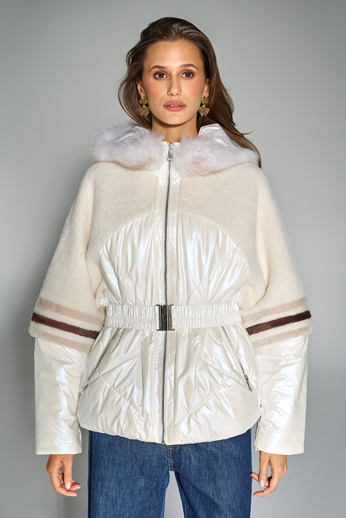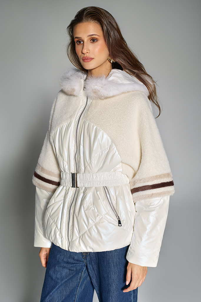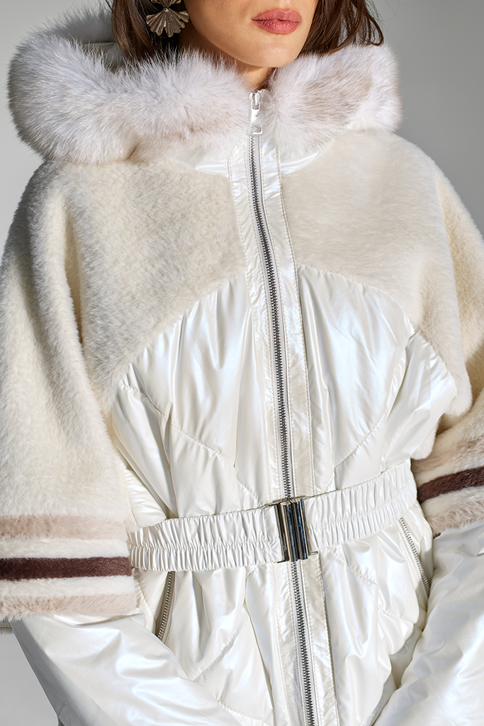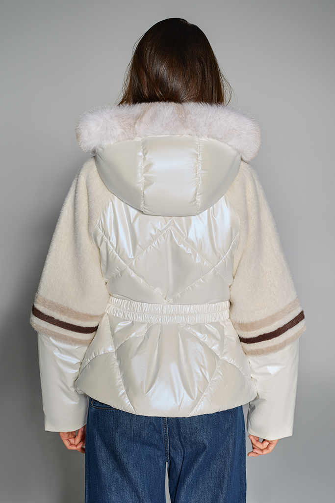 Geaca de fas cu alcantara si blana naturala de vulpe polara, Alb, Carolina Design