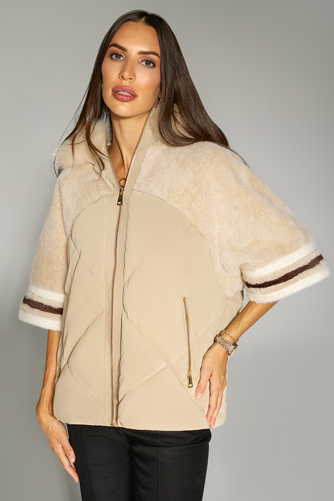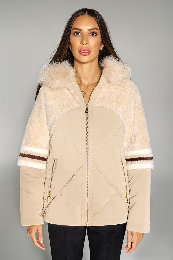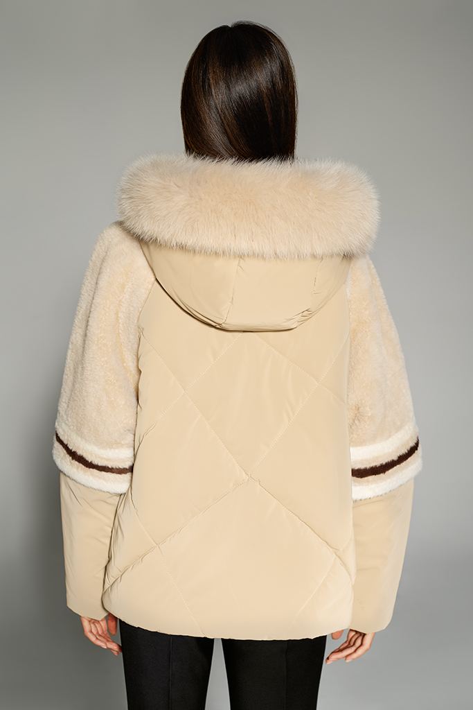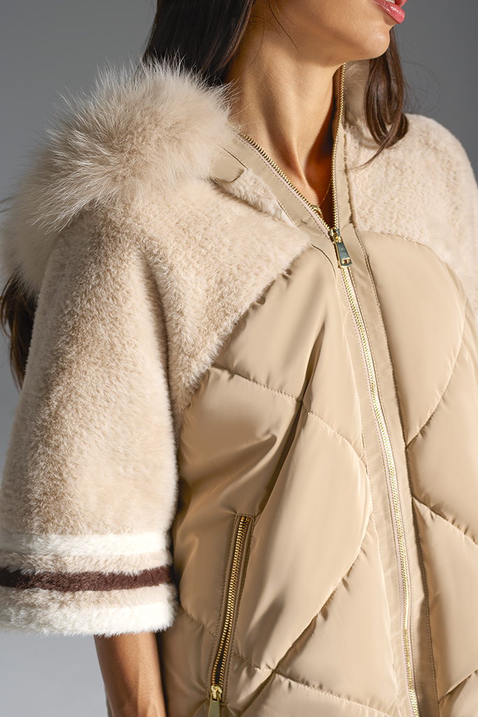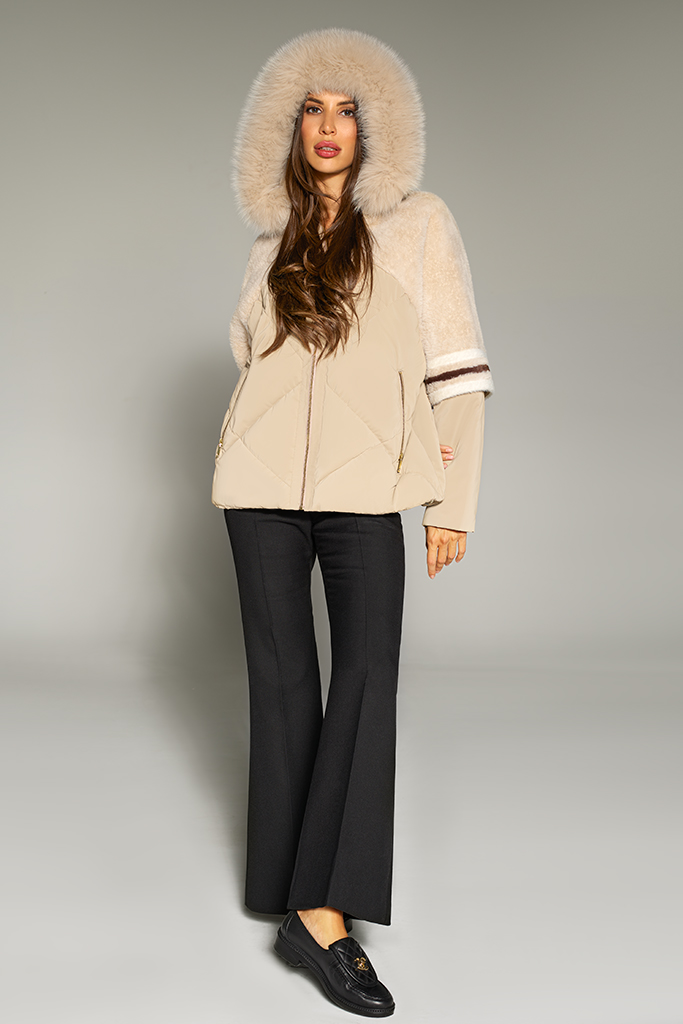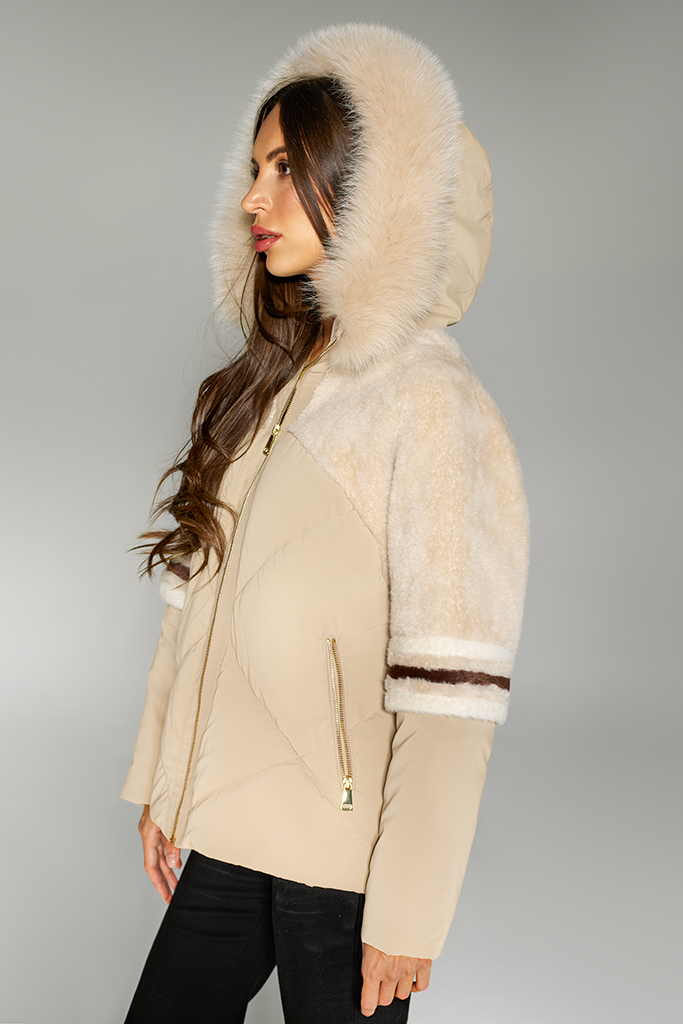 Geaca de fas cu alcantara si blana naturala de vulpe polara, Bej, Carolina Design