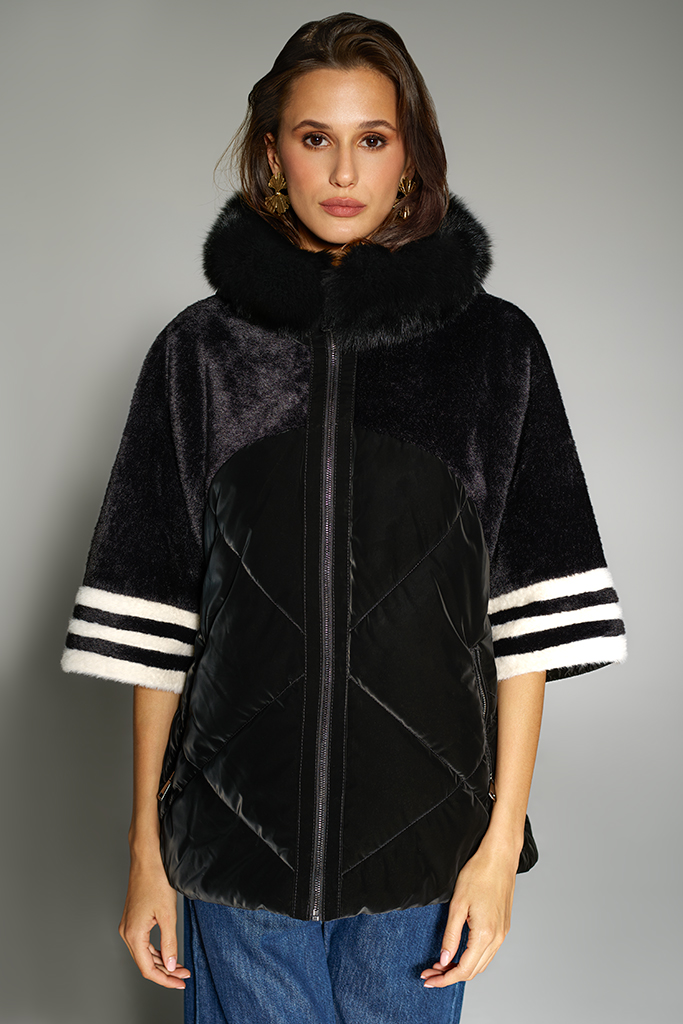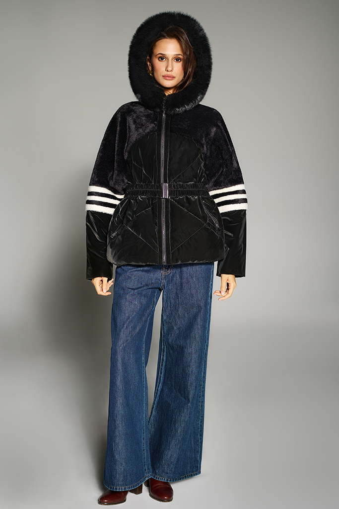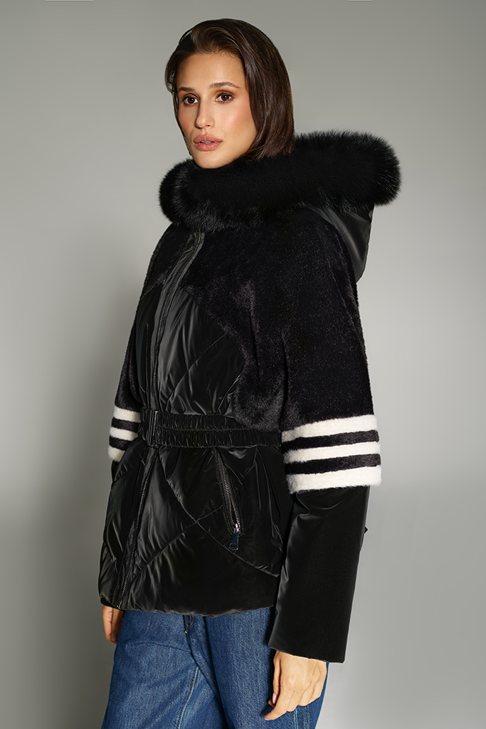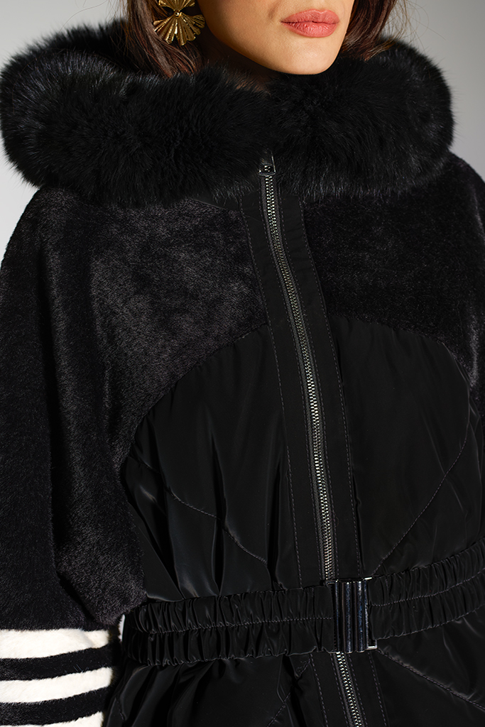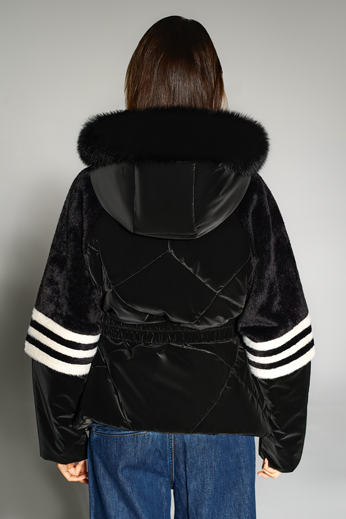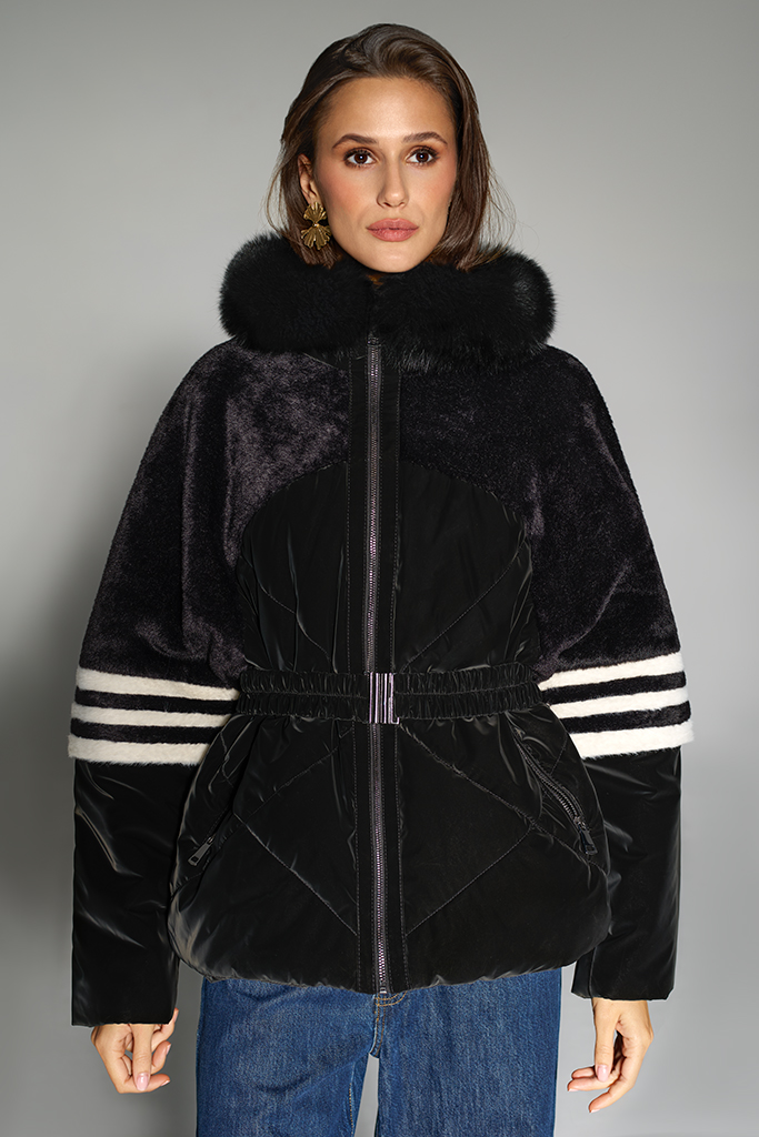 Geaca de fas cu alcantara si blana naturala de vulpe polara, Negru, Carolina Design