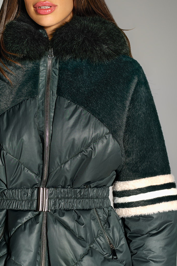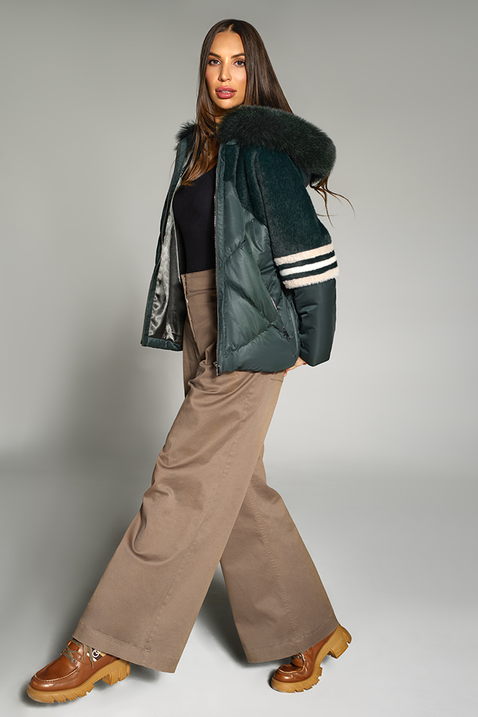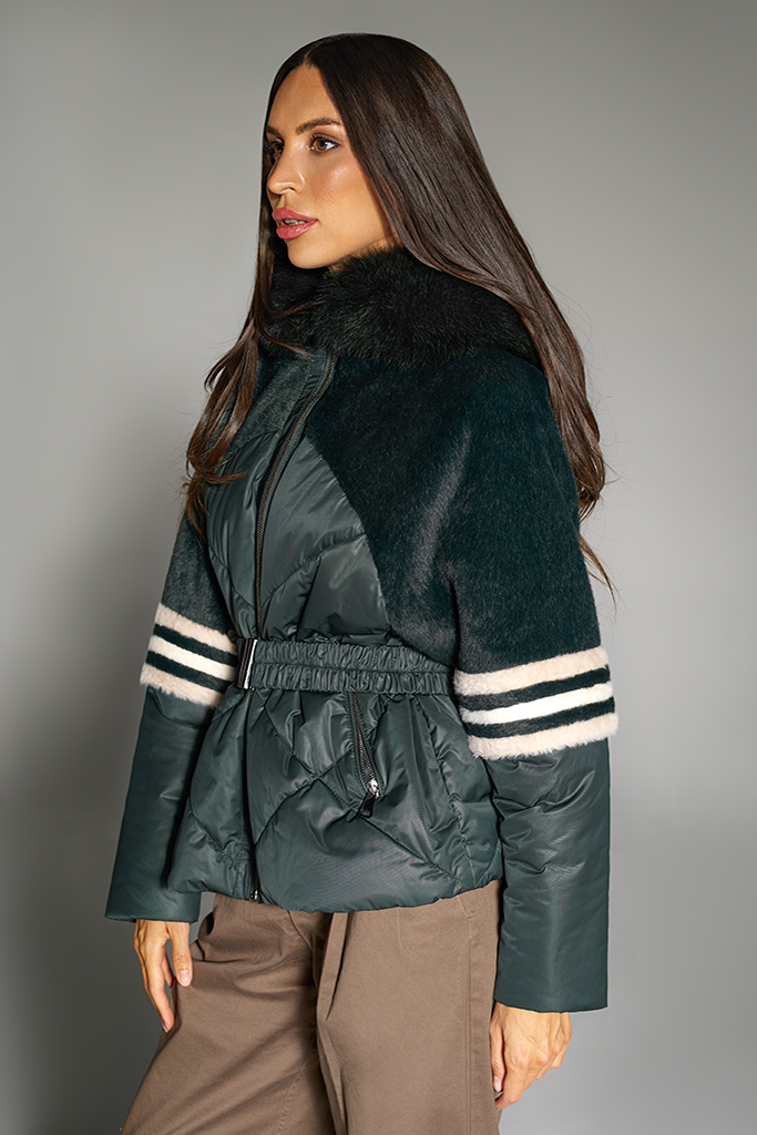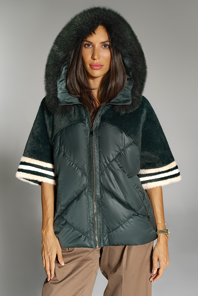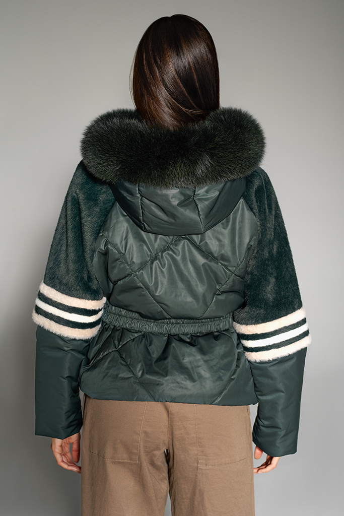 Geaca de fas cu alcantara si blana naturala de vulpe polara, Verde, Carolina Design