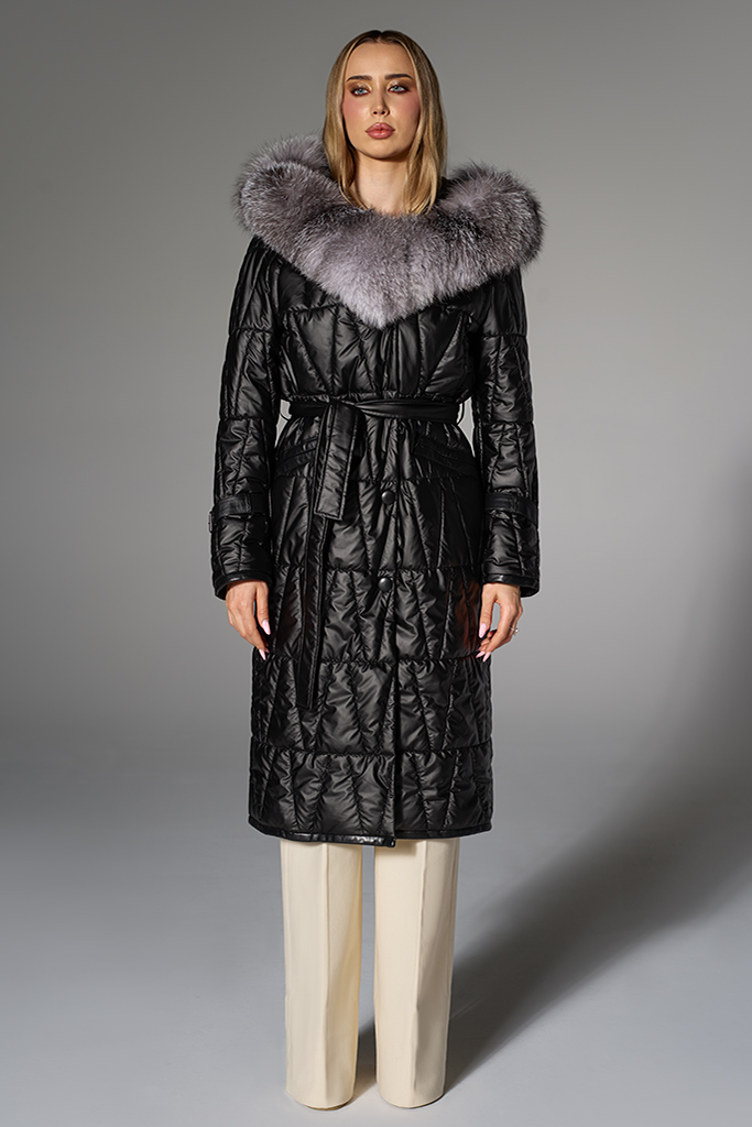 Confecționată din fâș de calitate superioară, în nuanță elegantă de negru, geaca este completată de o glugă amplă, căptușită cu blană naturală de vulpe Frost, care adaugă volum, căldură și un plus de rafinament fiecărei ținute. Contrastul subtil dintre luciul fâșului și textura bogată a blănii evidențiază detaliile premium și conferă o apariție sofisticată și actuală.