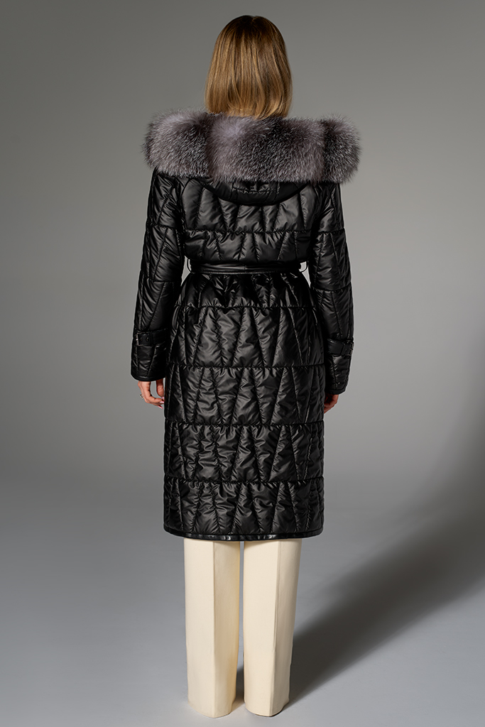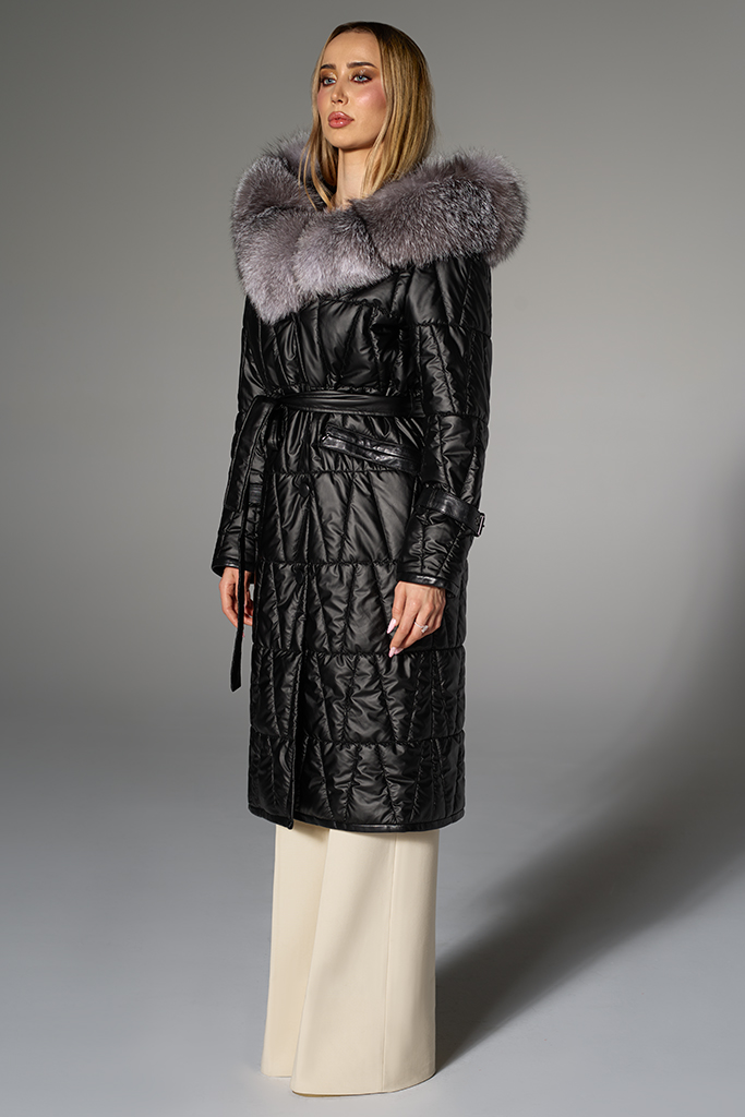 Detalii: croială modernă, închidere cu nasturi, cordon pentru cambrerea taliei, buzunare cu accente decorative, catarame din piele pe mâneci, glugă amplă cu blană naturală, finisaje premium.