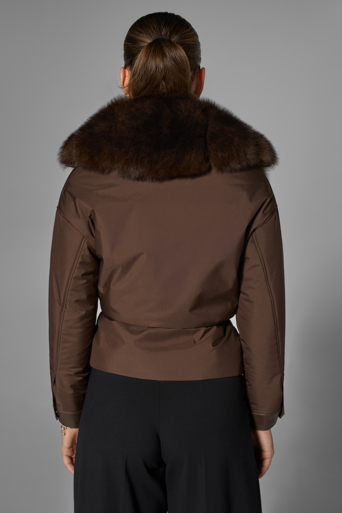 Această geacă îmbină funcționalitatea unei piese moderne cu rafinamentul blănii naturale de vulpe samur aplicate la guler, oferind profunzime cromatică și un plus de sofisticare.