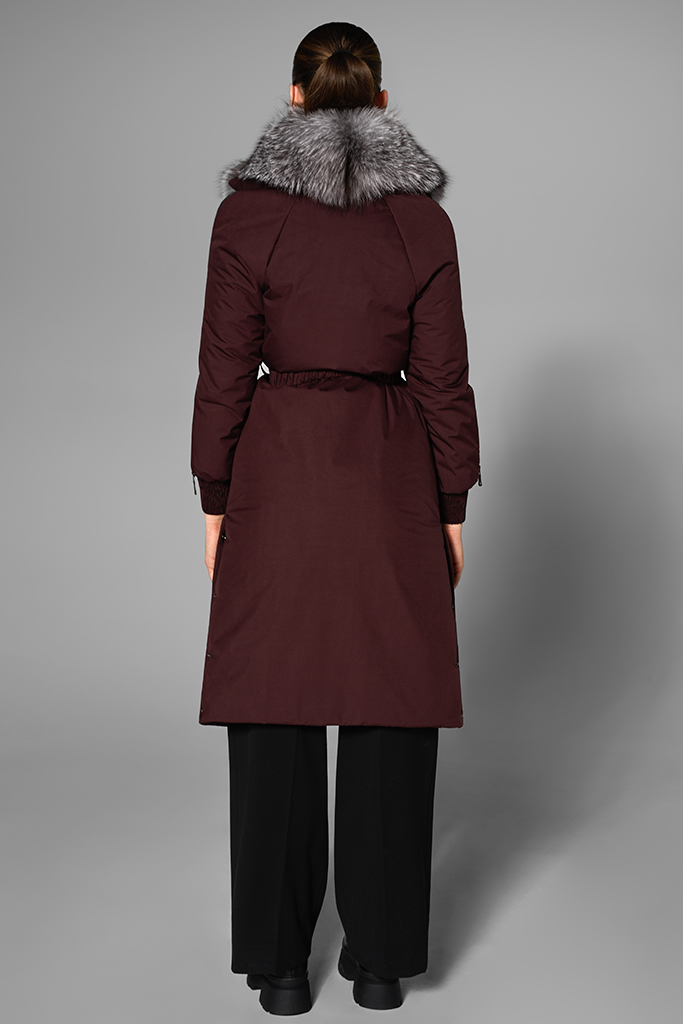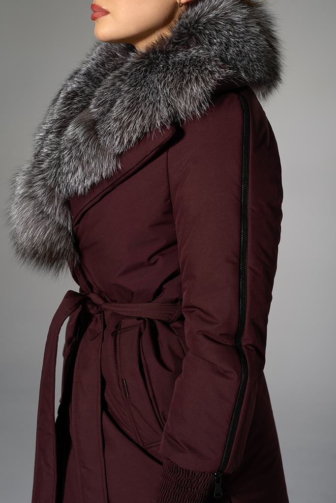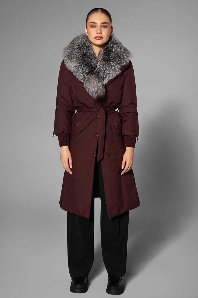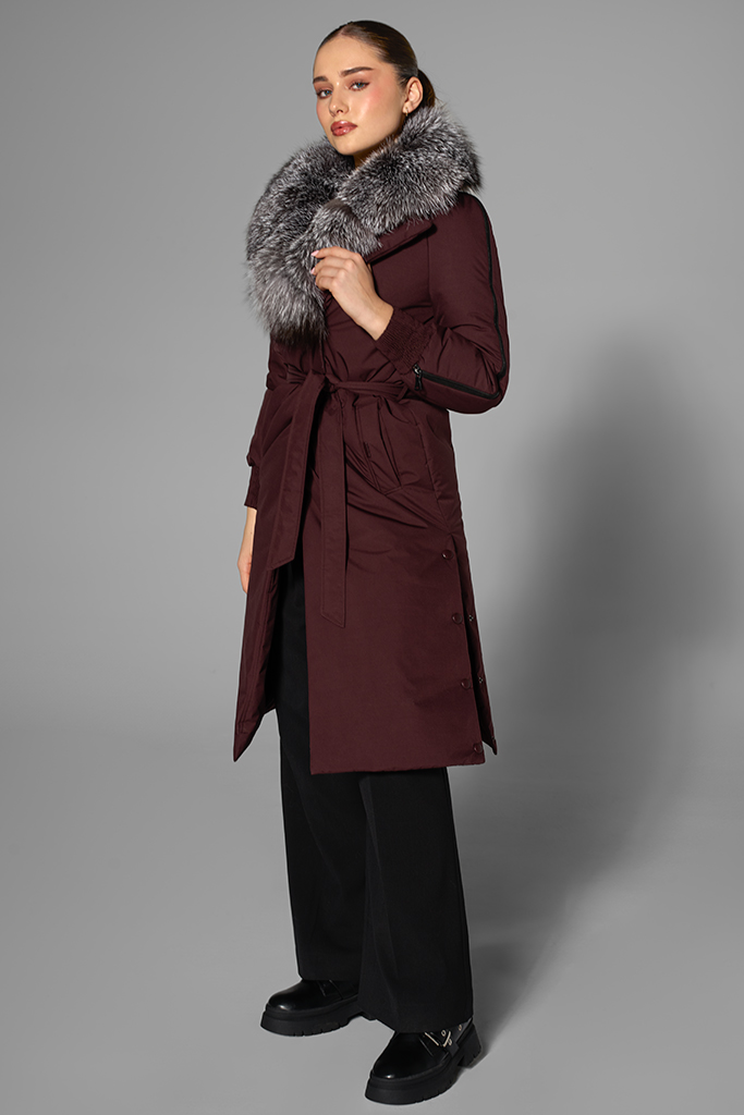 Confecționată din fâș de calitate superioară, cu guler spectaculos din blană naturală de vulpe argintie, geaca conferă un aer sofisticat fiecărei ținute. Nuanța profundă de burgundy scoate în evidență textura bogată a blănii și oferă adâncime look-ului, creând un efect elegant și actual.