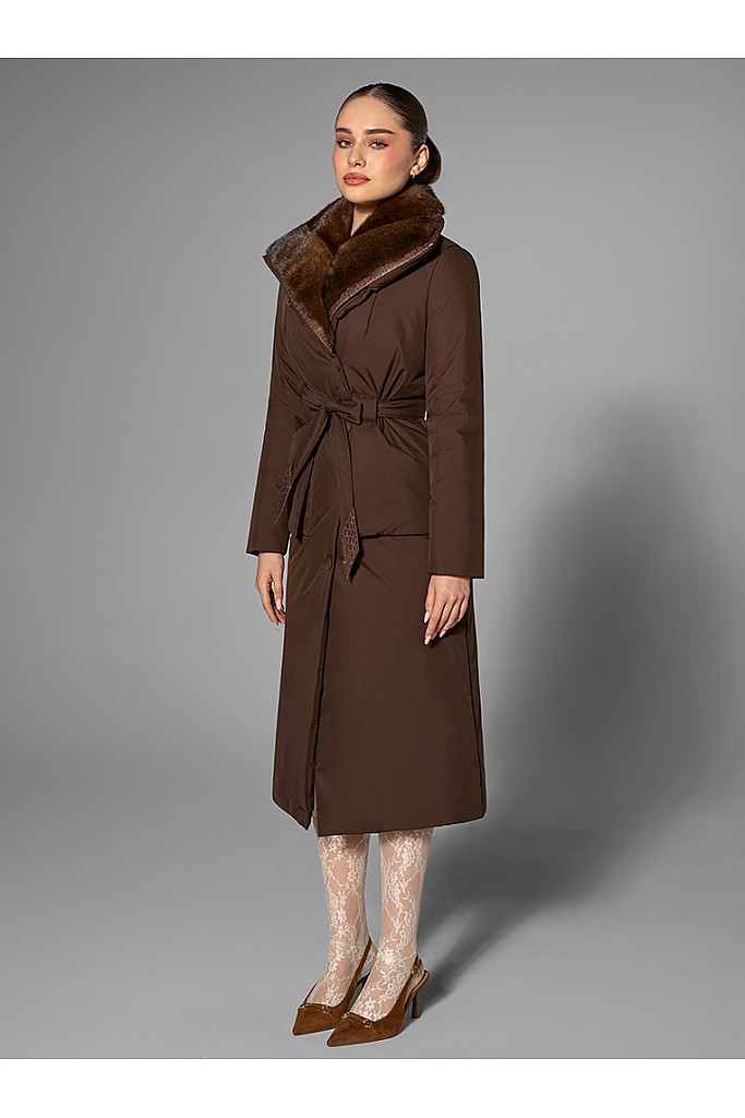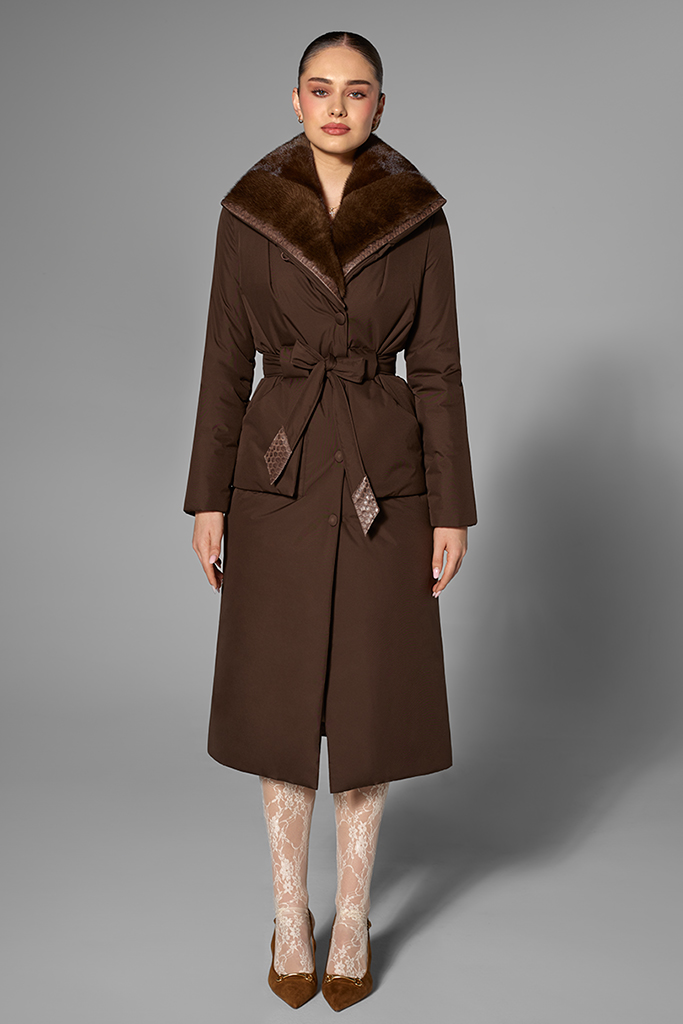 Detalii: croială modernă, închidere cu nasturi, cordon pentru conturarea taliei cu accente din piton, două buzunare laterale, guler din blană naturală de vizon, finisaje premium.