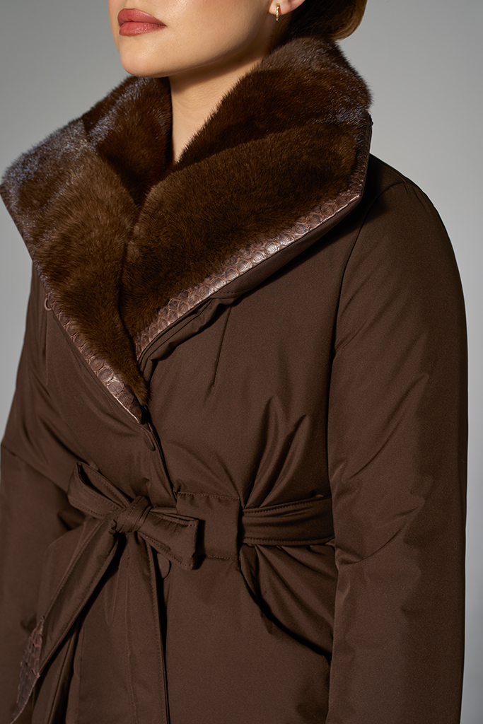Confecționată din fâș de calitate superioară, cu guler din blană naturală de vizon și accente elegante din piele de piton, geaca oferă un aspect sofisticat și versatil. Nuanța caldă de maro evidențiază subtil contrastul dintre materiale și pune în valoare fiecare detaliu, oferind o apariție elegantă și actuală.