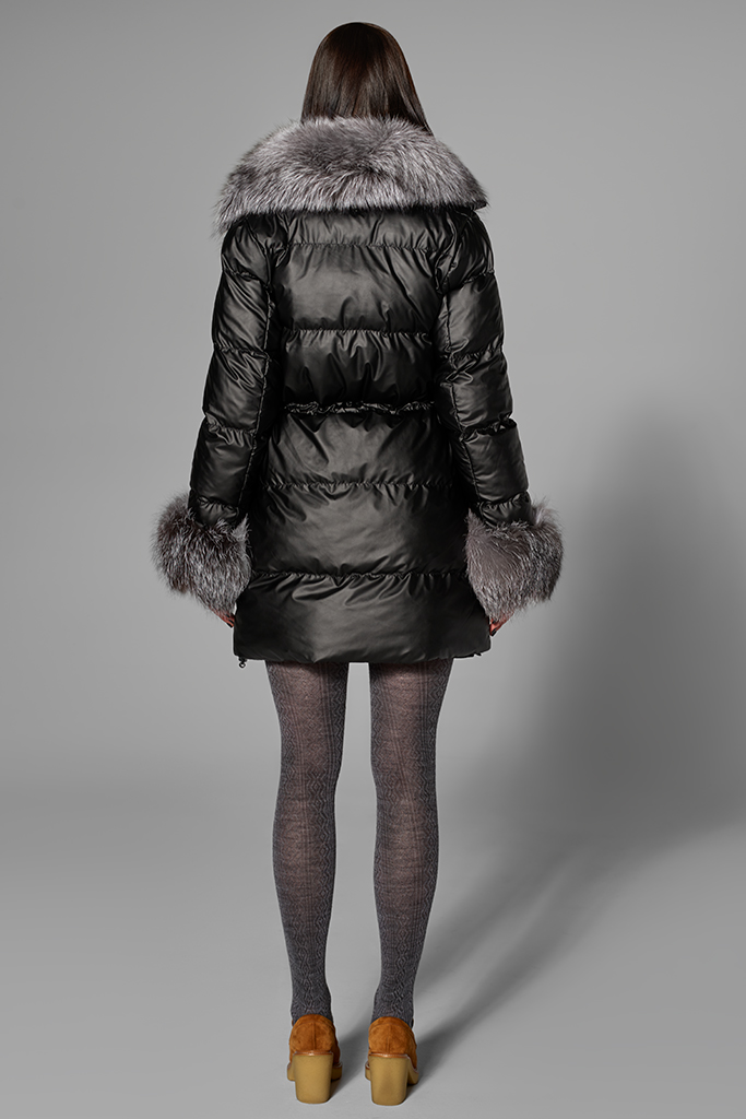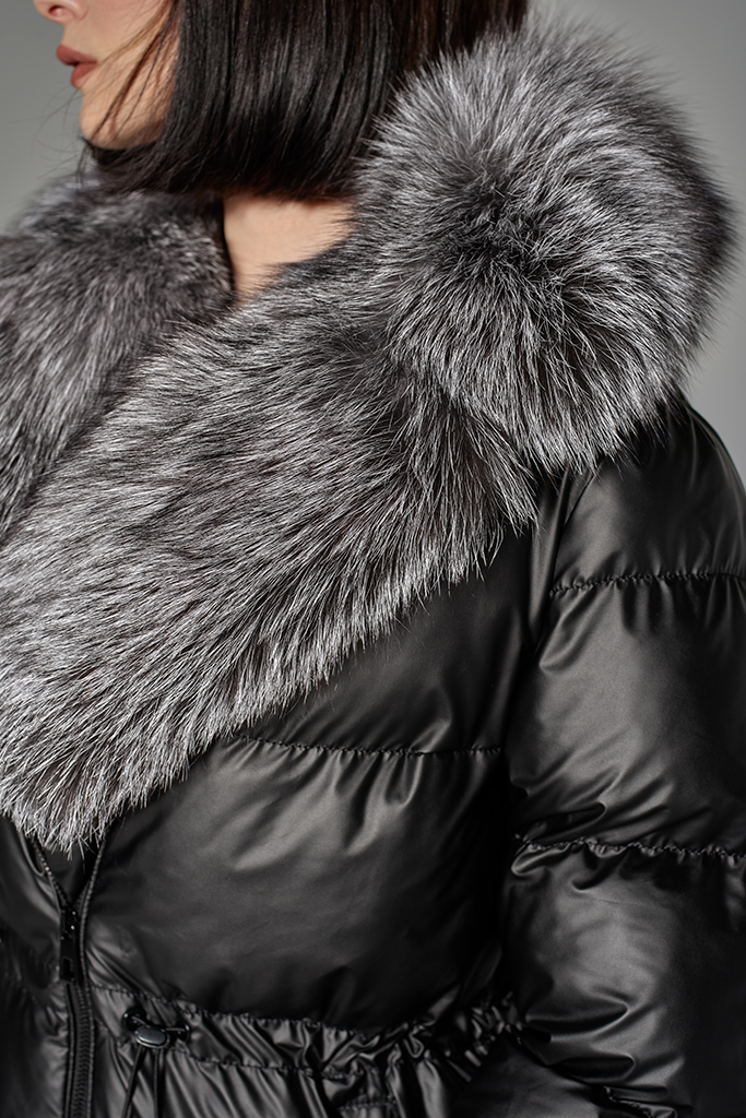 Detalii: croială modernă, șnur elastic pentru cambrerea taliei, buzunare laterale, guler din blană naturală de vulpe argintie, manșete din blană, finisaje premium.