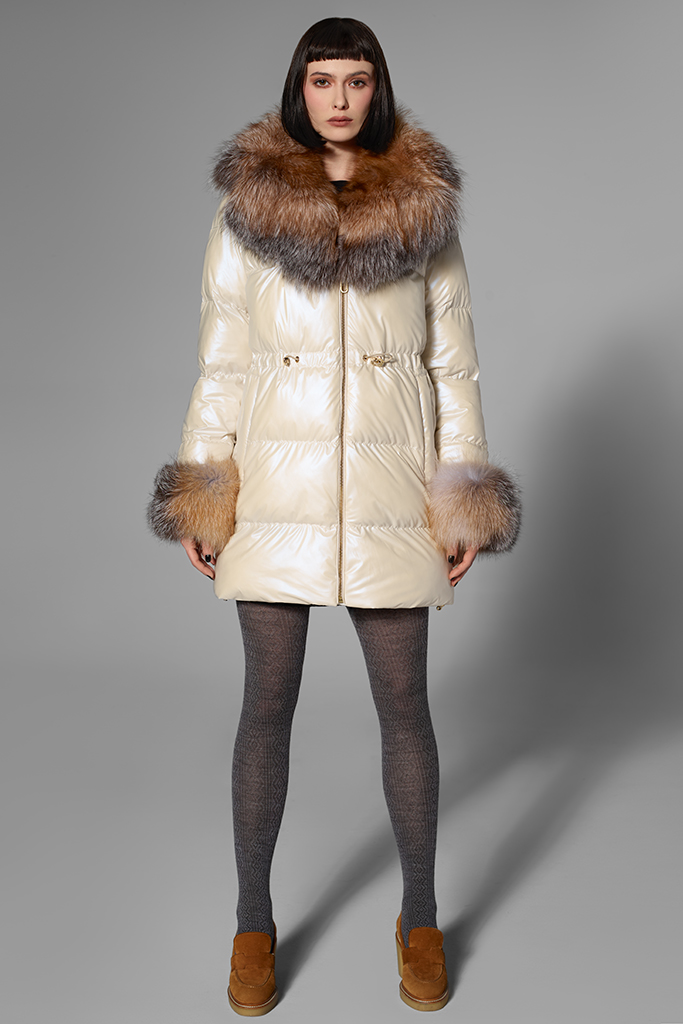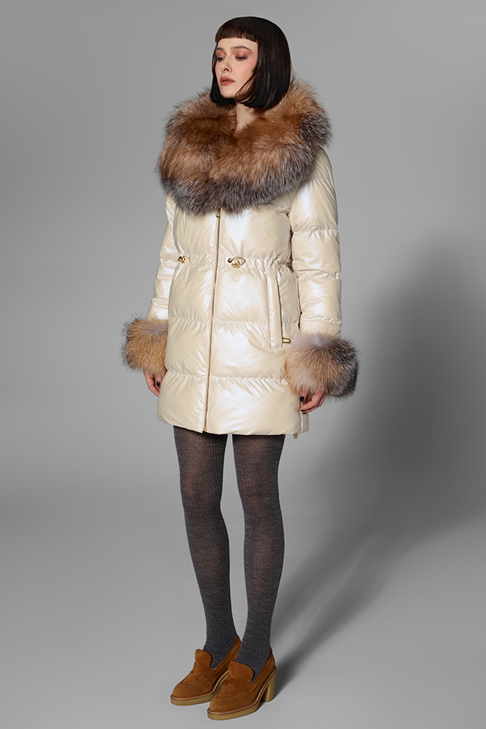 Confecționată din fâș de calitate superioară, cu guler și manșete spectaculoase din blană naturală de vulpe canadiană, geaca conferă o notă de distincție fiecărei ținute. Nuanța delicată de bej scoate în evidență textura bogată a blănii și adaugă profunzime look-ului, oferind o apariție elegantă și actuală.
