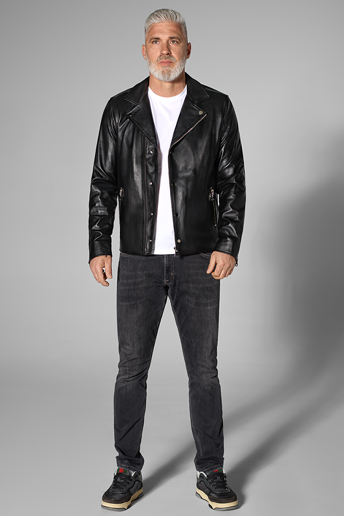 Geaca Beckam este confecționată din piele naturală Nappa de cea mai înaltă calitate, cu o textură fină, lucioasă, care conferă un aspect impecabil și sofisticat. Designul tip biker include fermoare pentru închidere și detalii luxoase, accentuând stilul modern și masculin al piesei.