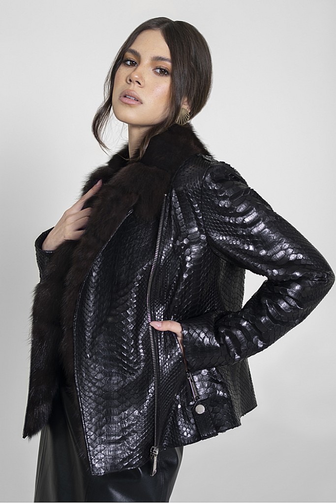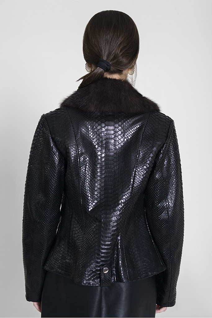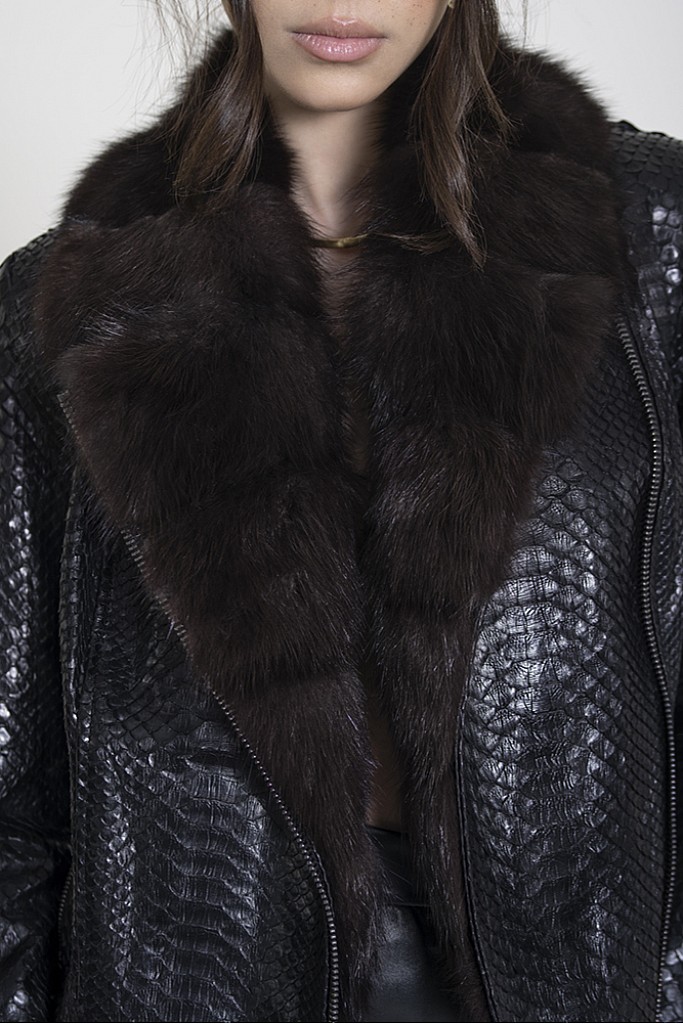 Geaca de piele naturala de piton negru cu blana de samur, Gianna, Carolina Design