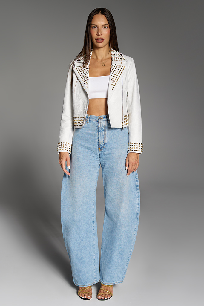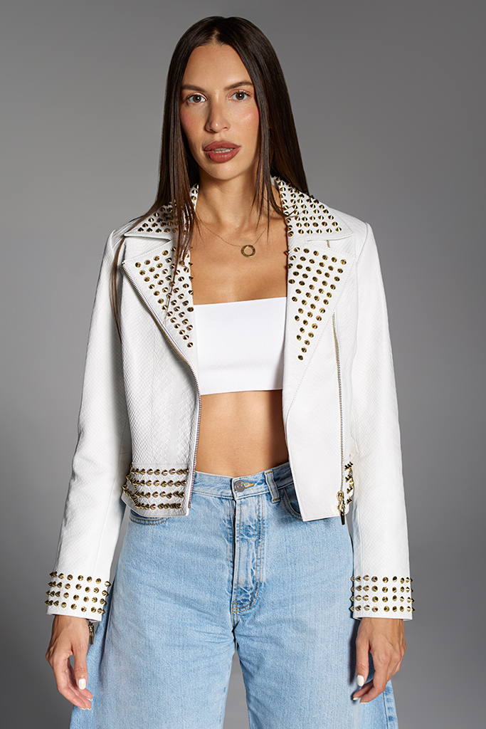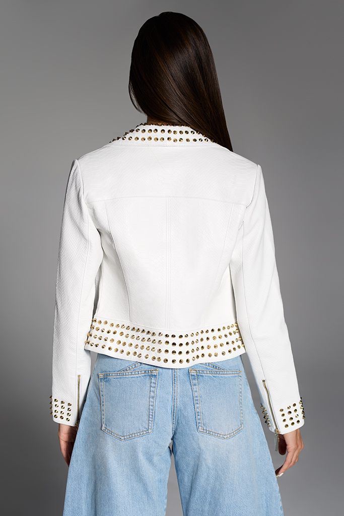 Geaca de piele naturala imprimeu piton, cu tinte, White, Carolina Design
