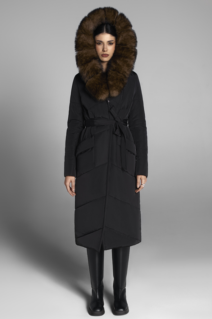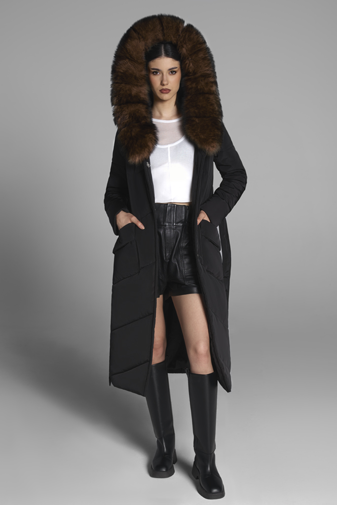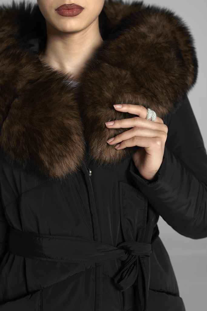 Geaca parka cu blana naturala de Vulpe Samur , cu gluga , Negru , Olivia , Carolina Design