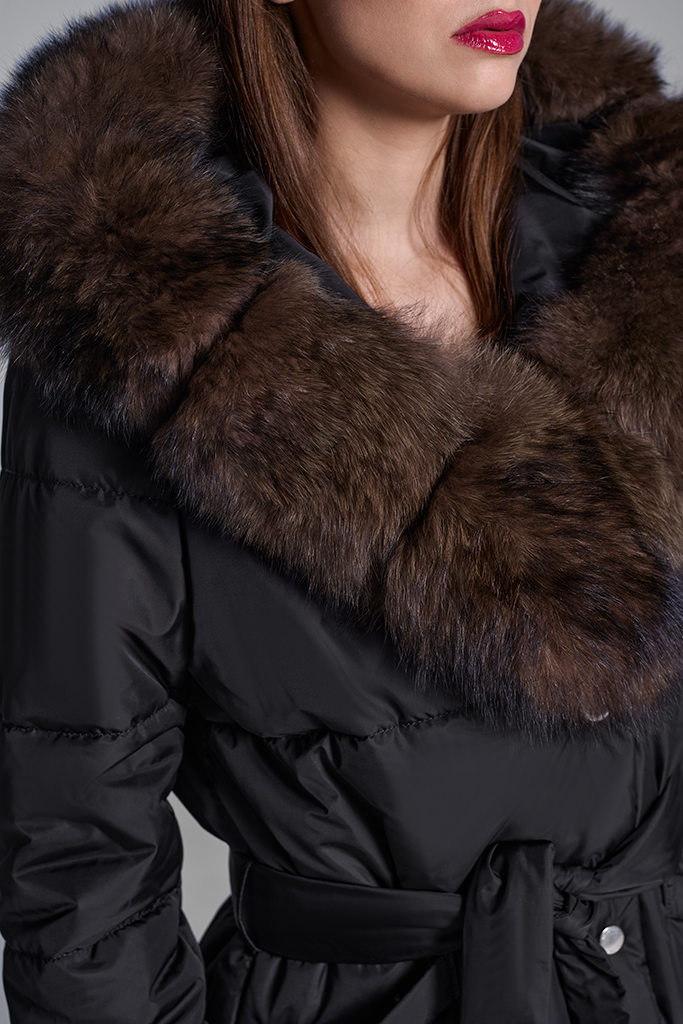 Geaca parka Negru cu blană naturală de Vulpe Samur, cu glugă, Cataleya, Carolina Design