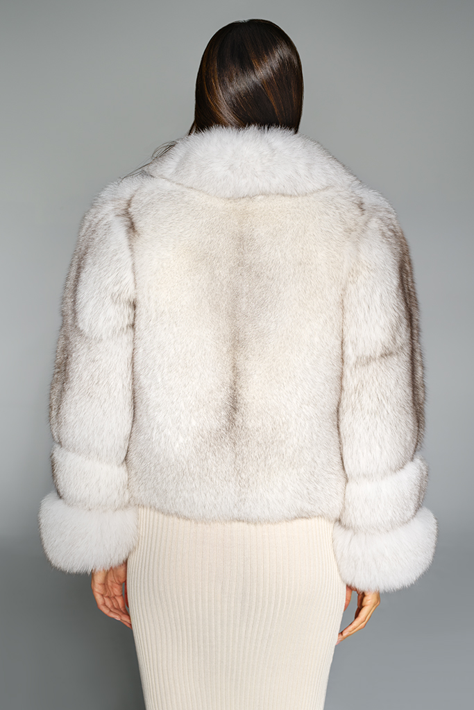 Creată din vulpe arctică, fără inserții sau suport de piele, piesa impresionează prin densitatea bogată și fluiditatea naturală a blănii, oferind un efect vizual amplu și sofisticat.