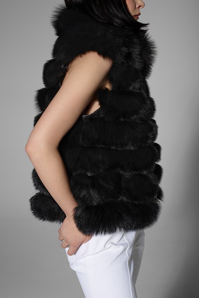Blana de vulpe polară neagră, montată pe suport de piele fină, oferă stabilitate și rezistență, iar interiorul căptușit cu satin asigură confort și o purtare plăcută.