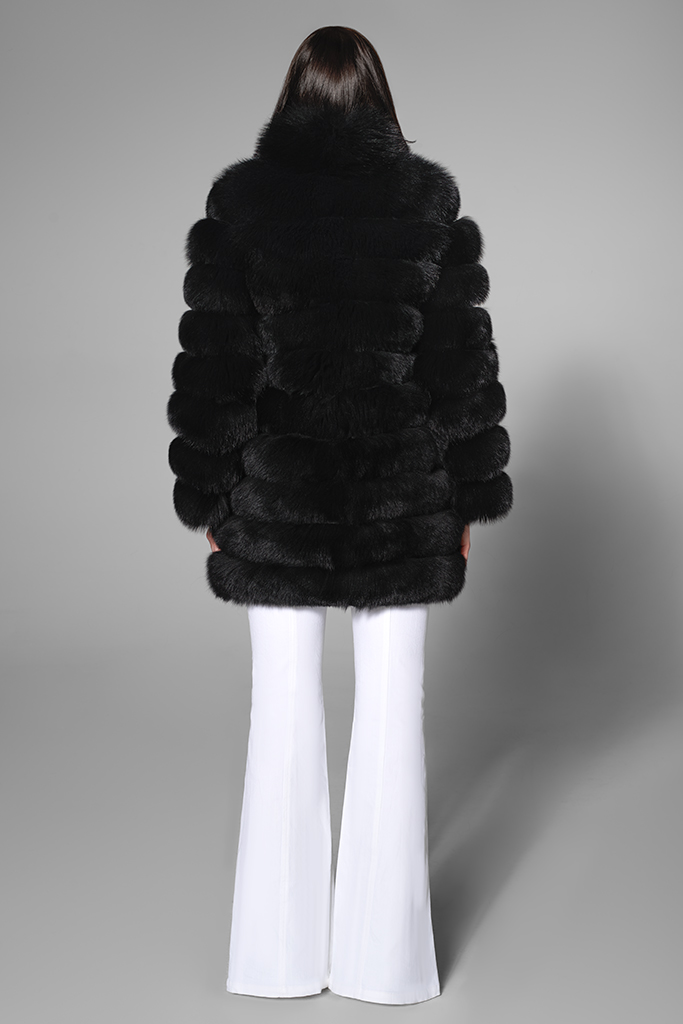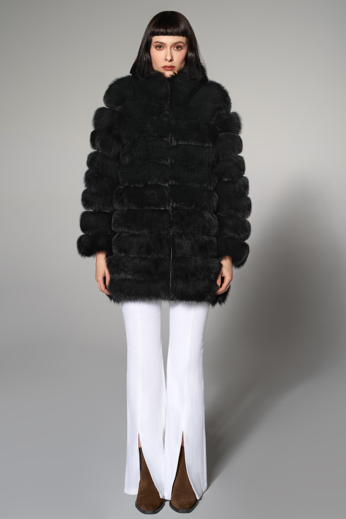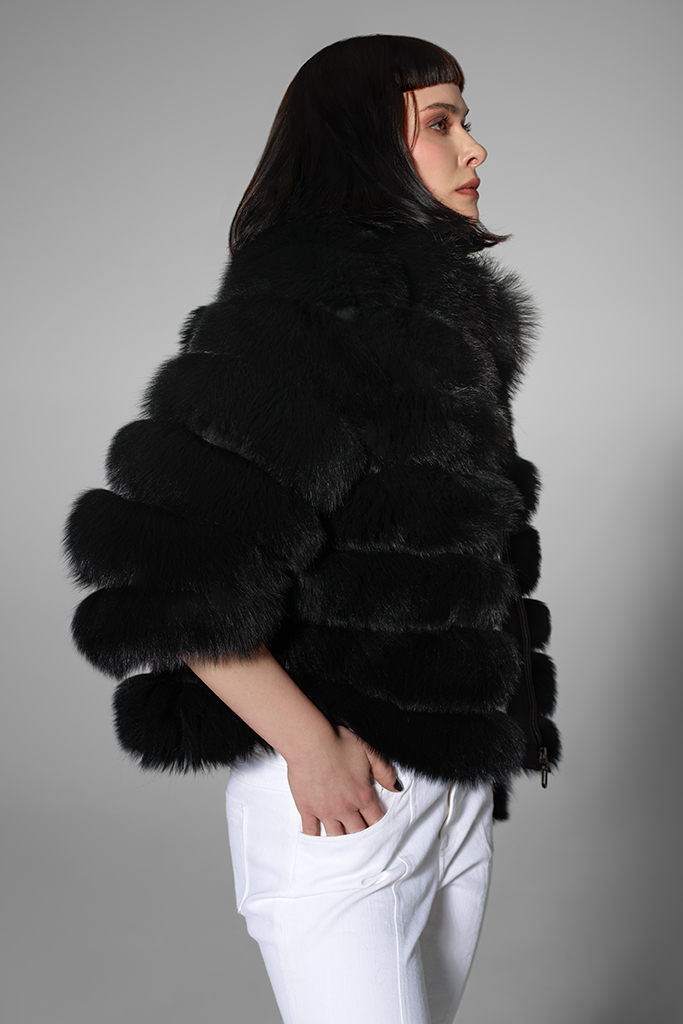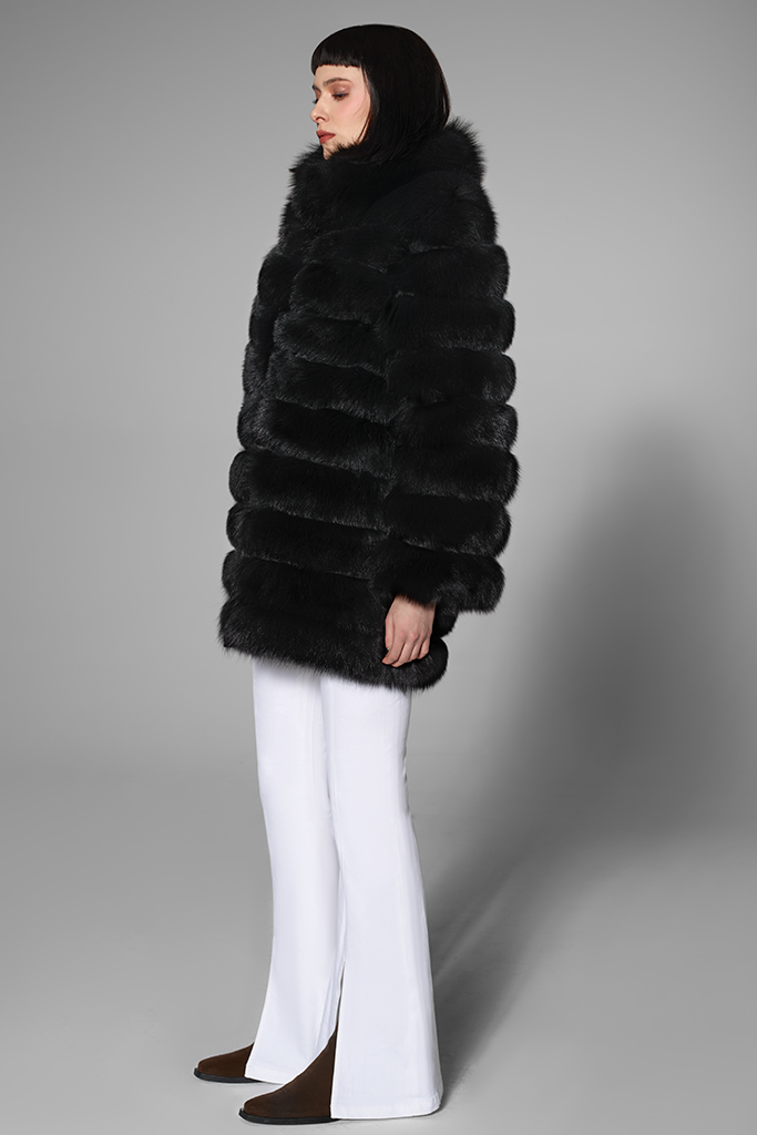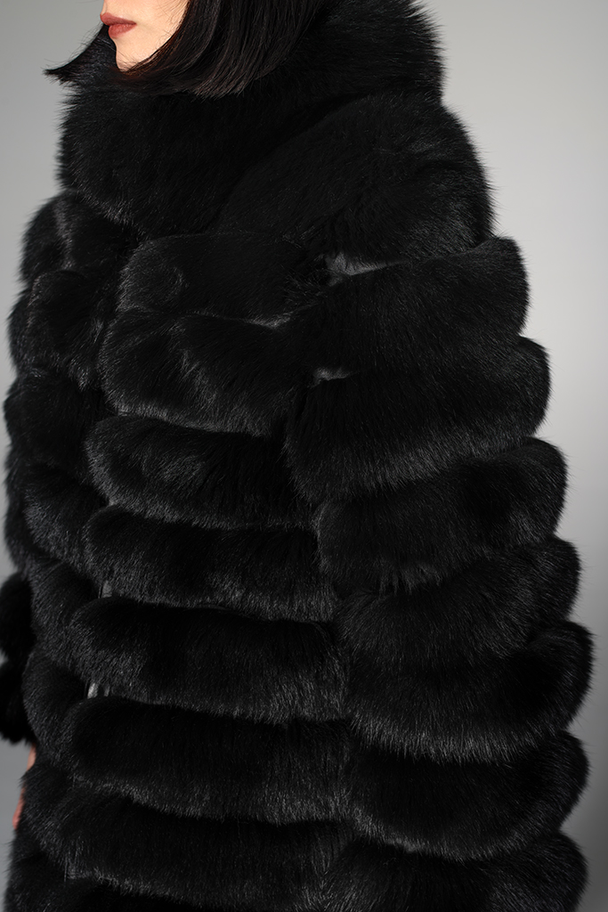 Haina din blană naturală de vulpe polară neagră impresionează prin volum bogat și eleganță distinctă, fiind o alegere ideală pentru garderoba unei femei moderne.