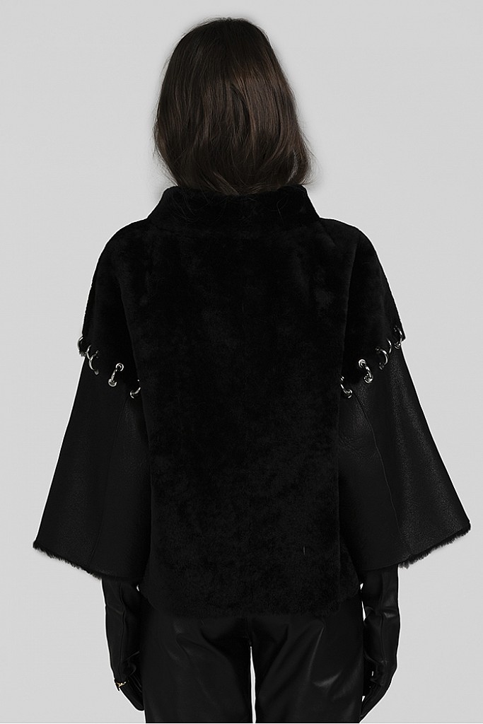 negru, prelucrat shearling, avand un croi amplu de tip poncho.