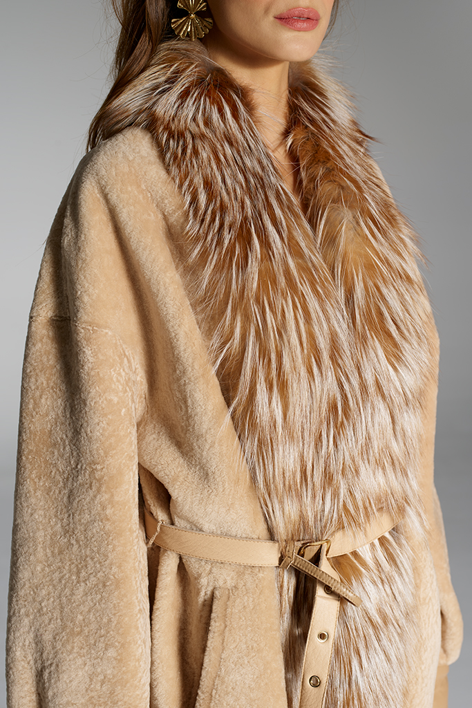 Haină de blană naturală din miel sud-african cu vulpe argintie, Bej, Carolina Design