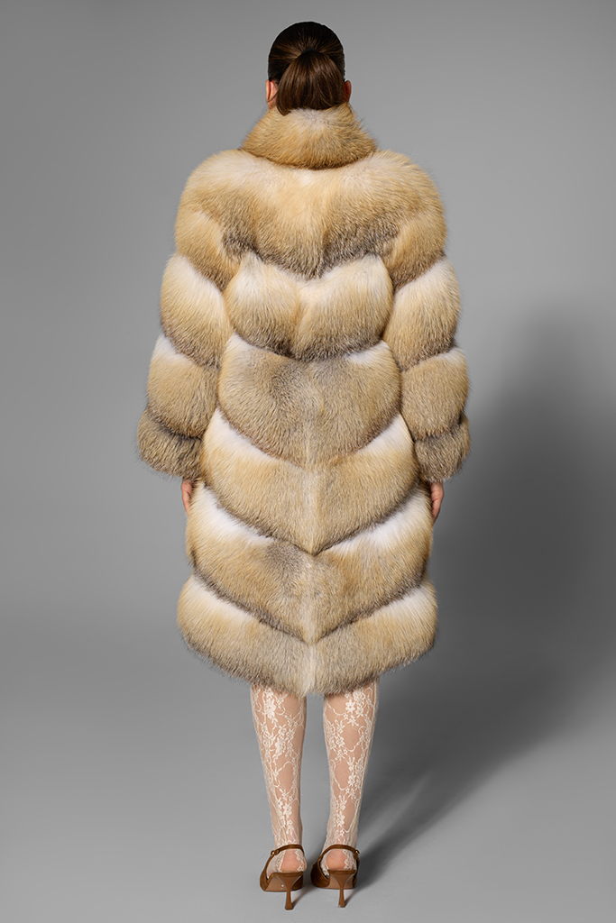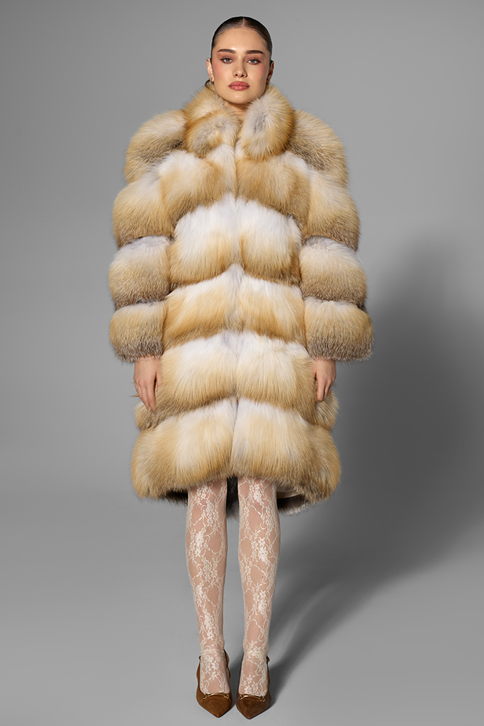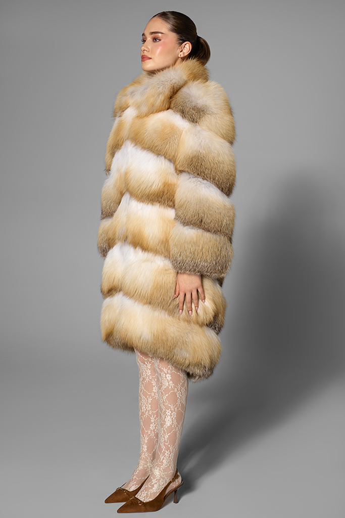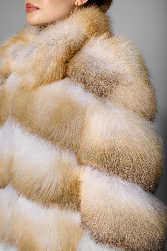 Această haină din blană naturală de vulpe Golden Island impresionează prin cromatica sa deosebită, unde tonurile calde de bej auriu se îmbină armonios cu accente mai intense, creând un efect vizual bogat și sofisticat.