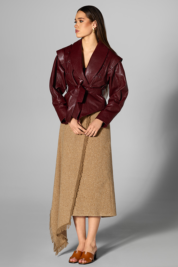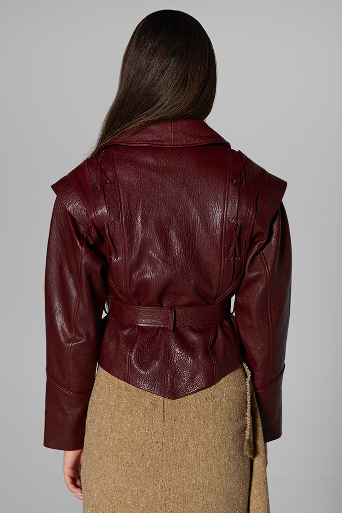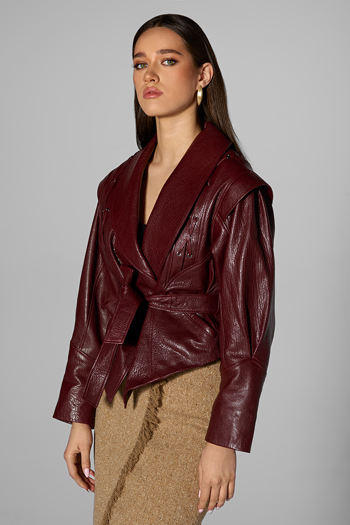 Geaca este realizată din piele naturală de calitate superioară, cu un finisaj aparte ce evidențiază textura și profunzimea nuanței. Designul contemporan, cu linii bine definite, oferă un aer sofisticat și actual, potrivit femeilor care apreciază piesele statement.