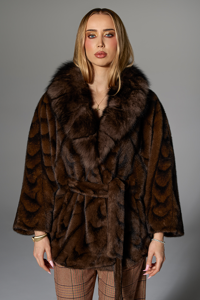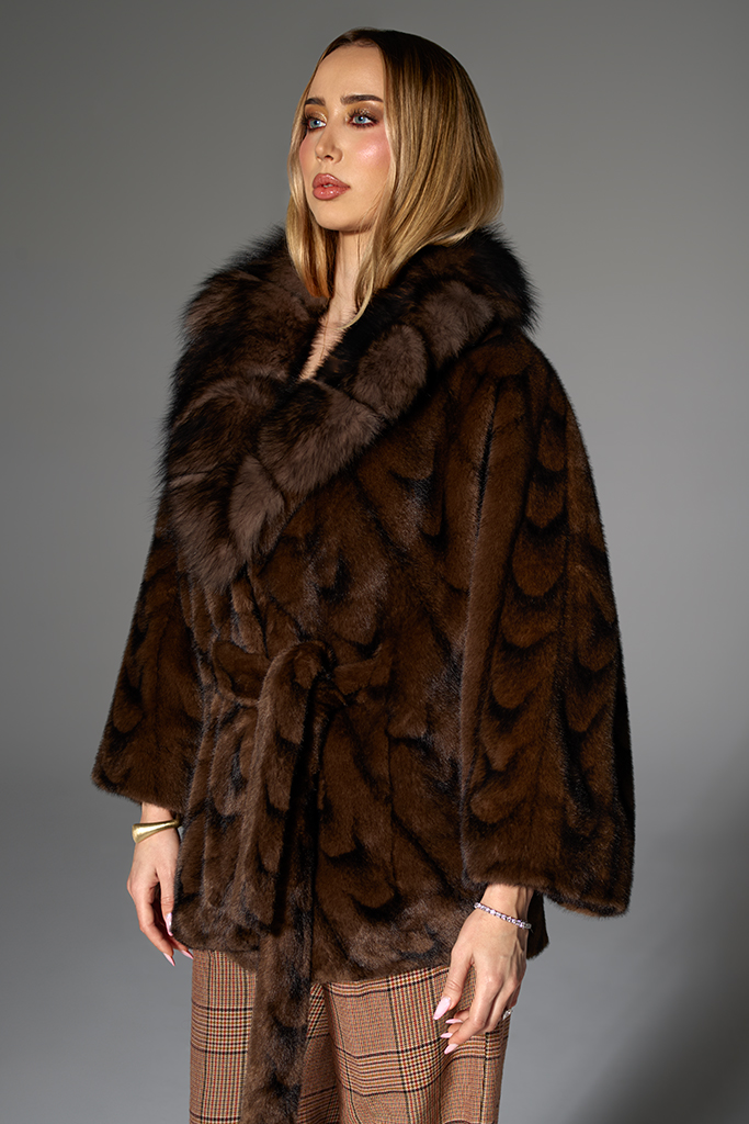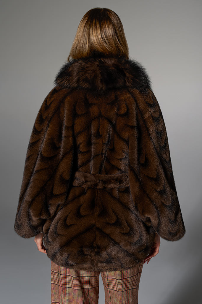 Poncho din alcantara cu blana naturala de vulpe polara si cordon, Brown, Carolina Design