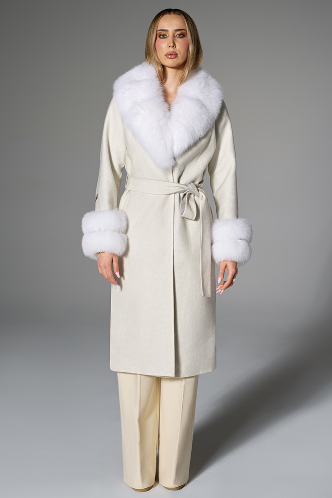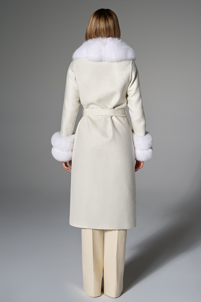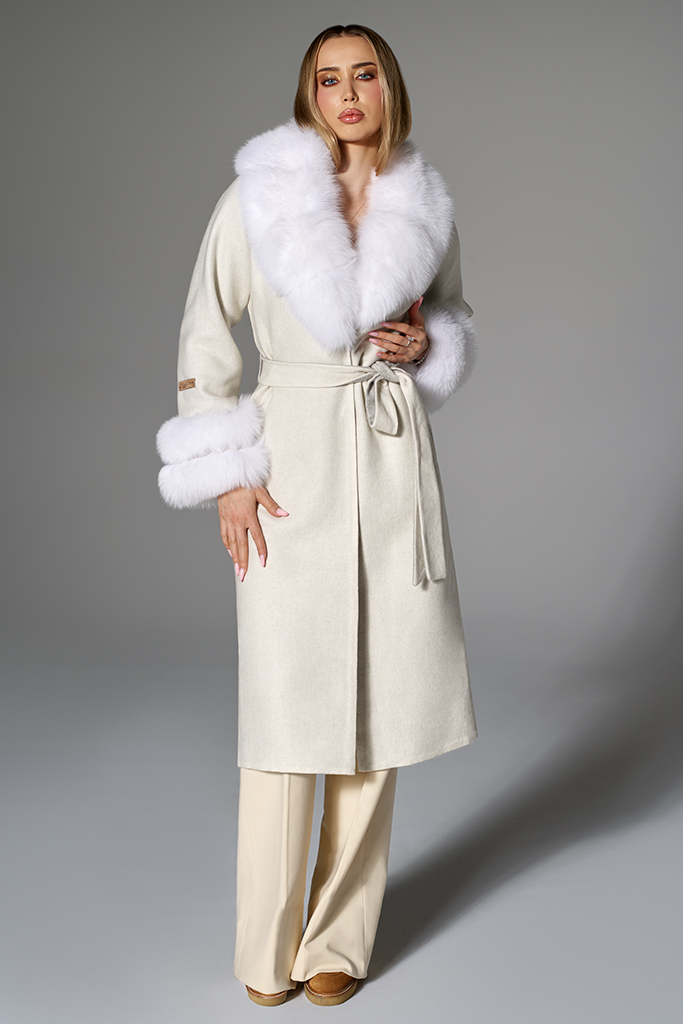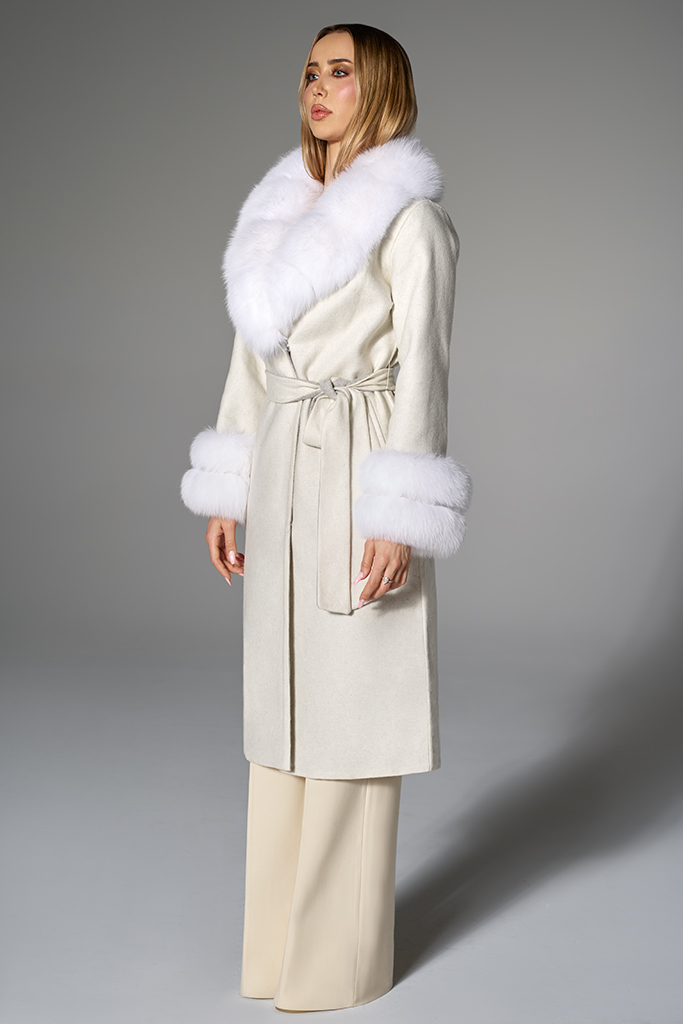 Palton din Lana de Alpaca cu blana naturala de Vulpe Arctica, Alb, Carolina Design