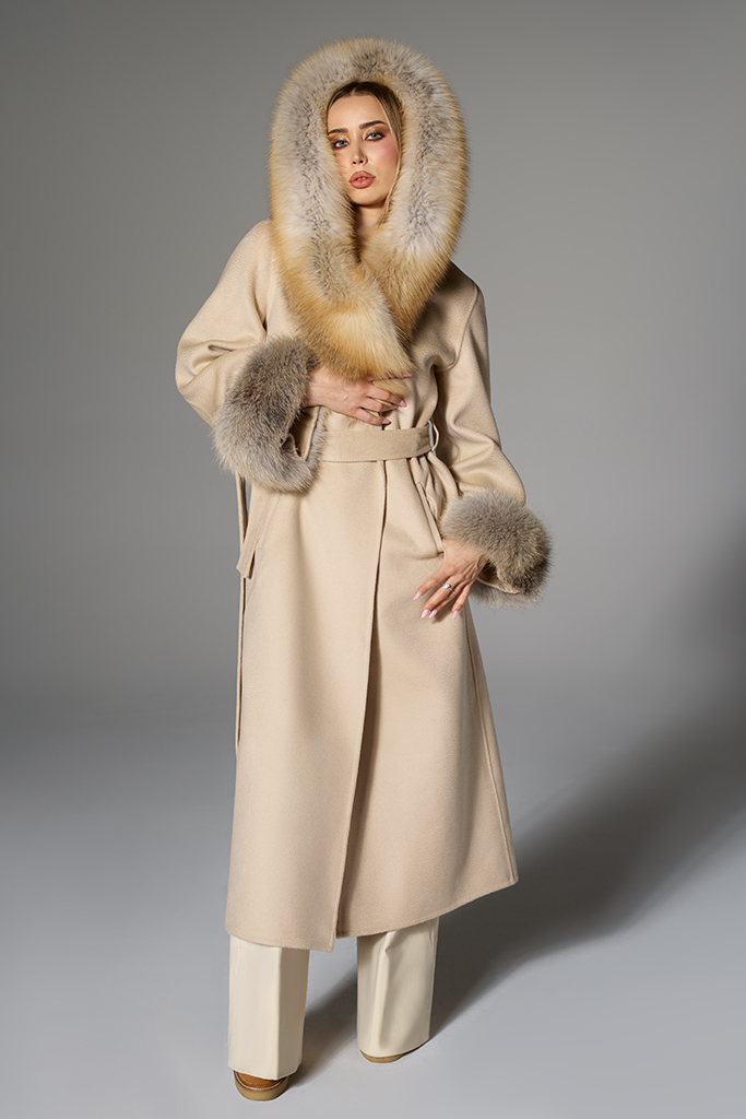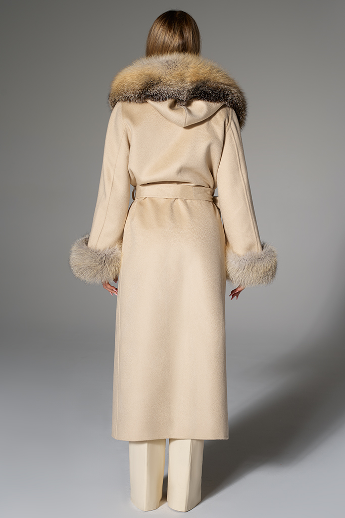 Palton din Casmir si Lana Merinos cu blana naturala de Vulpe Polara, Beige, Cobra, Carolina Design