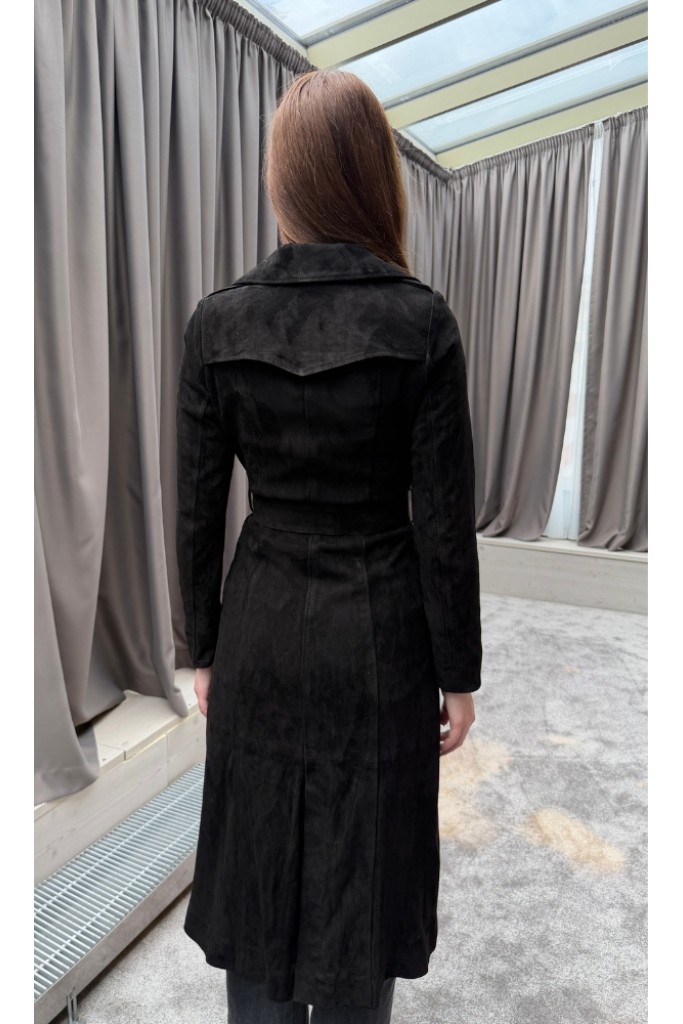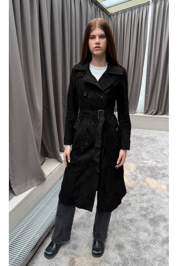Detalii: piele naturală întoarsă, croială lungă tip trench, închidere cu nasturi, buzunare laterale, finisaje premium.