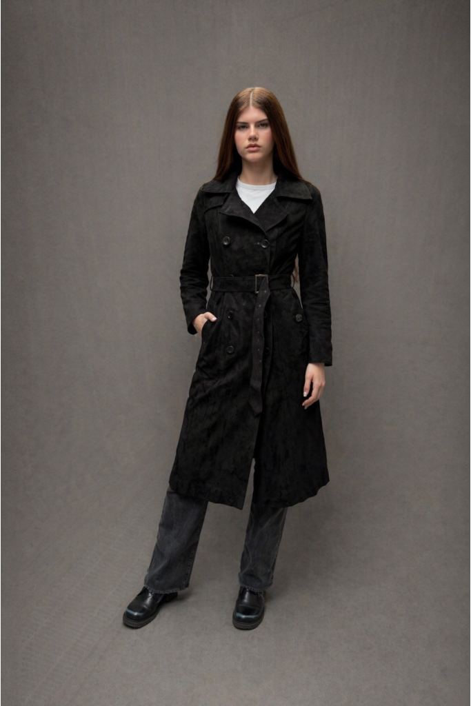 Trench din piele naturala intoarsa, V line, Black, Carolina Design
