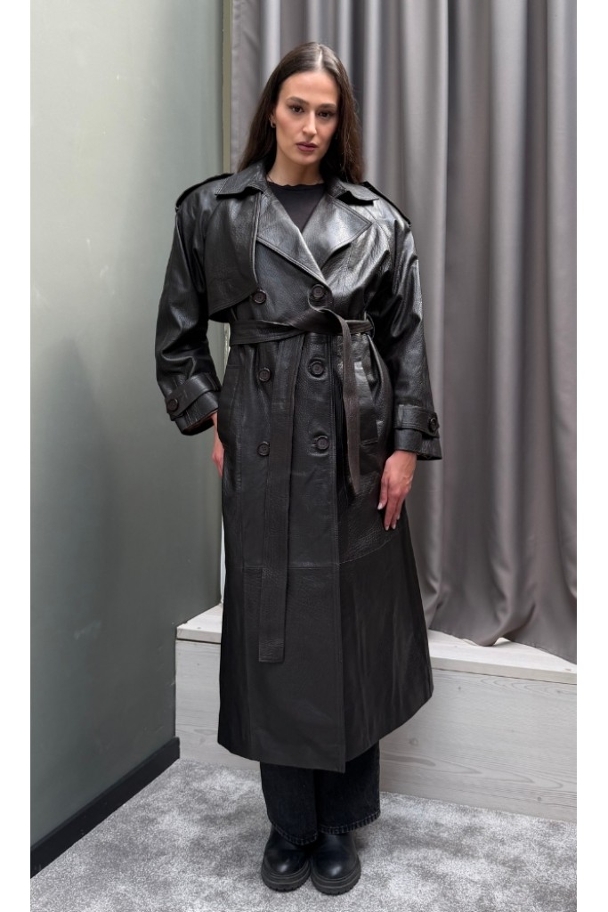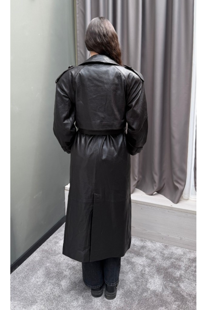 Detalii: piele naturală Nappa, efect jumbo, croială lungă tip trench, închidere dublu rând de nasturi, buzunare laterale, finisaje premium.