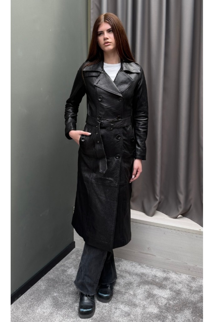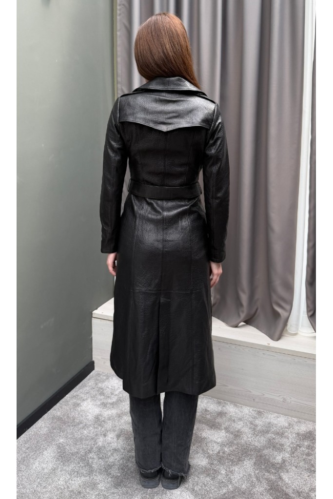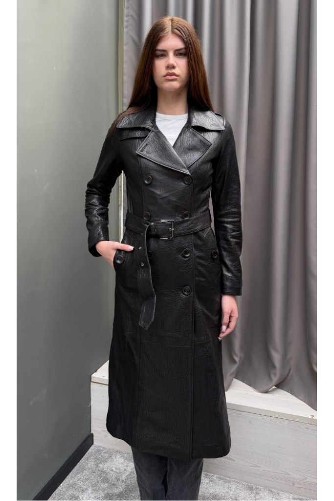 Detalii: piele naturală Nappa, efect jumbo, croială lungă tip trench, închidere dublu rând de nasturi, buzunare laterale, finisaje premium.