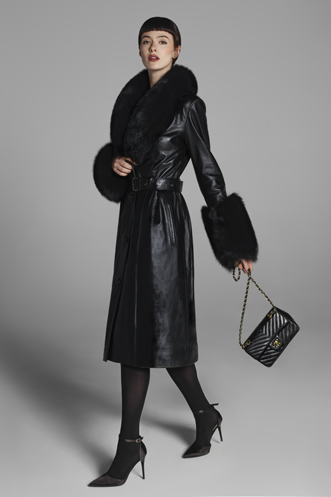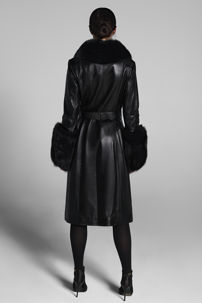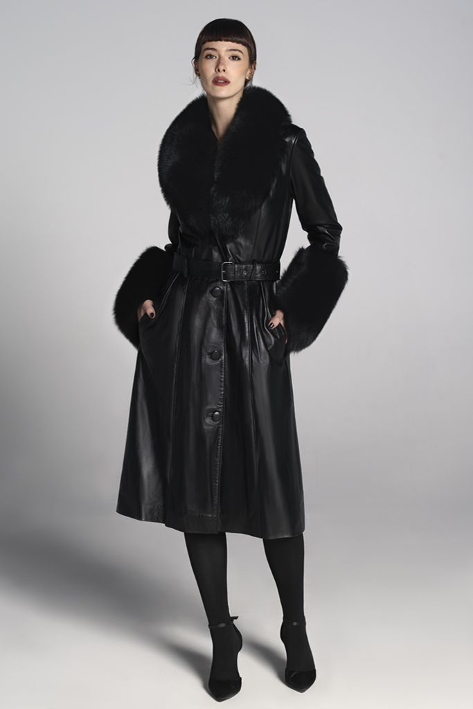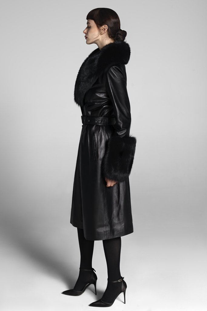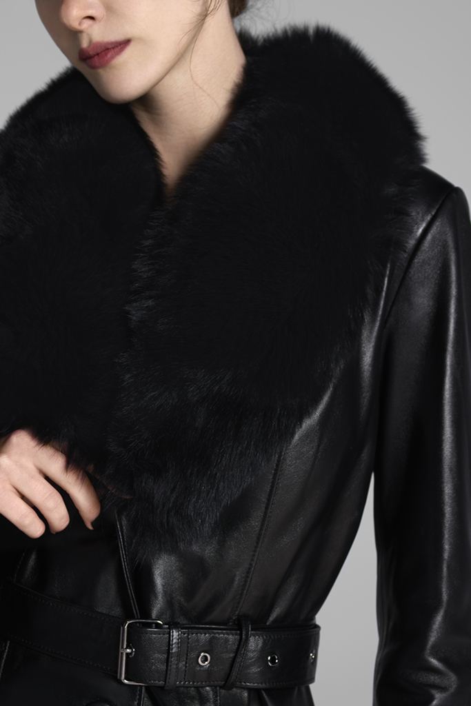 Trenci de piele naturala cu blana naturala de vulpe polara neagra , Black , Carolina Design