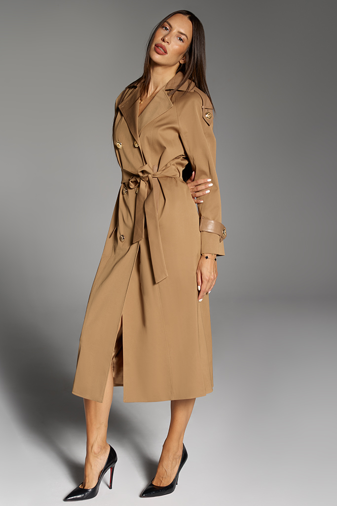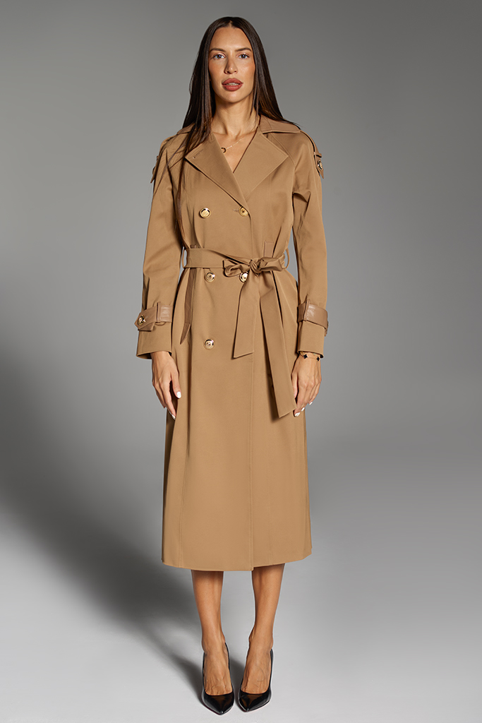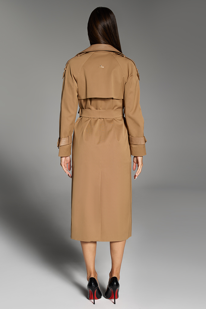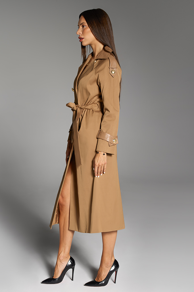 Trenci textil cu mansete si epoleti din piele naturala, Camel, Anais, Carolina Design