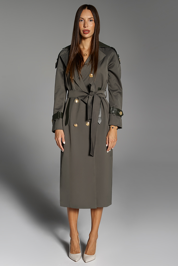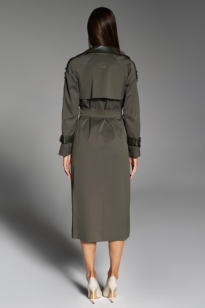 Trenci textil cu mansete si epoleti din piele naturala, Kaki, Cesima, Carolina Design