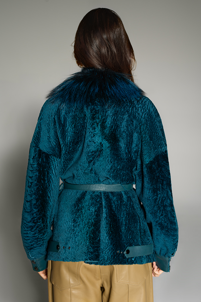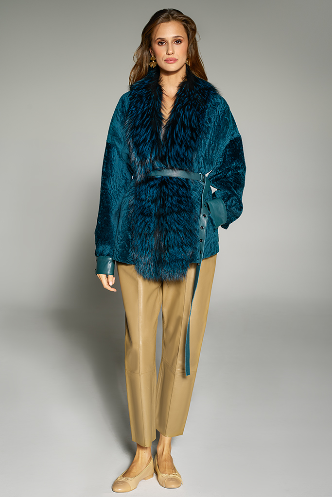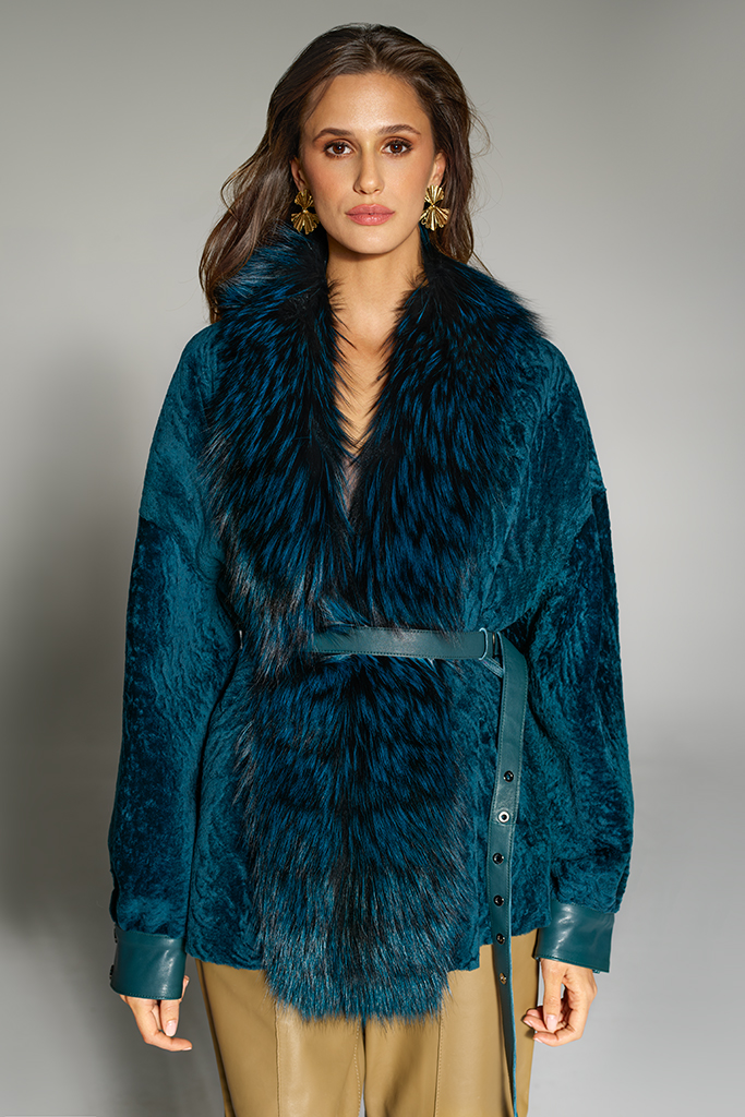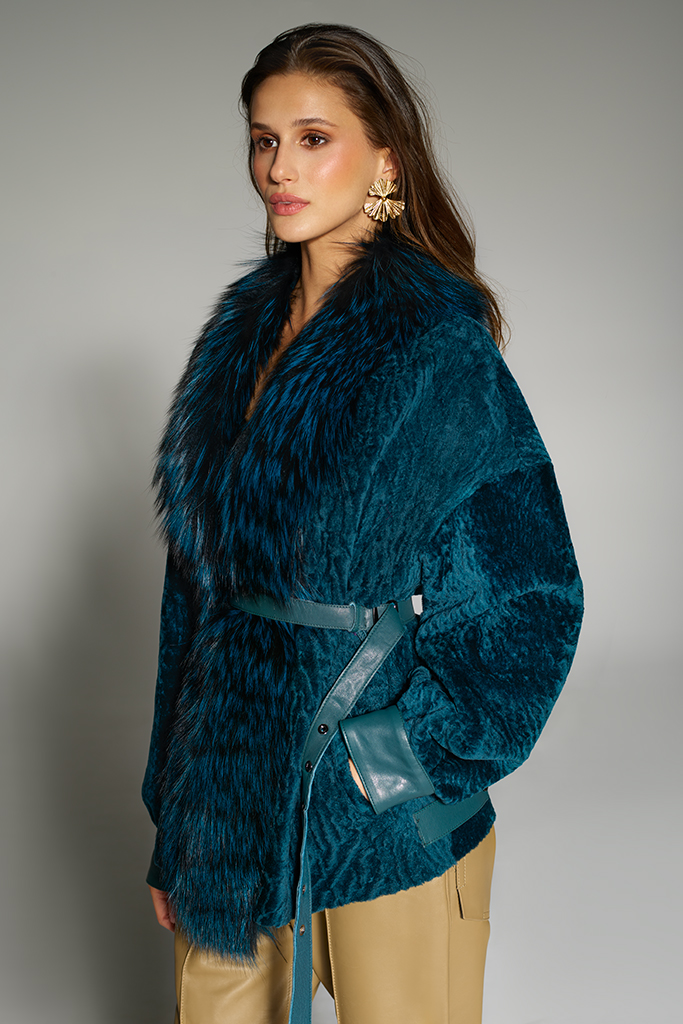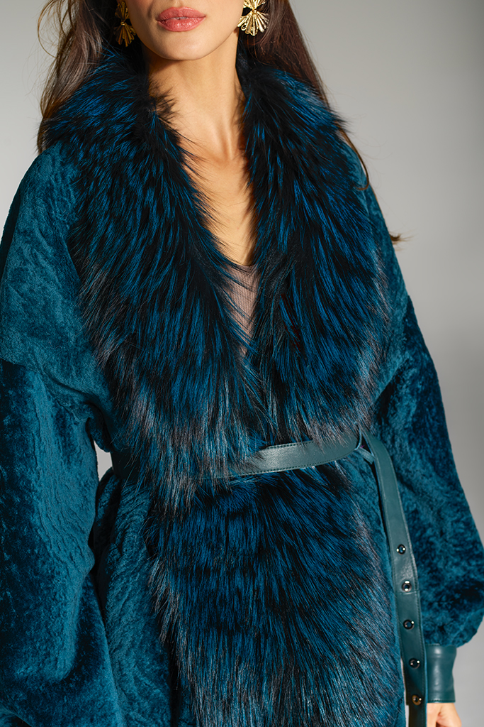Haină de blană naturală din miel sud-african cu vulpe argintie, Turcoaz, Carolina Design