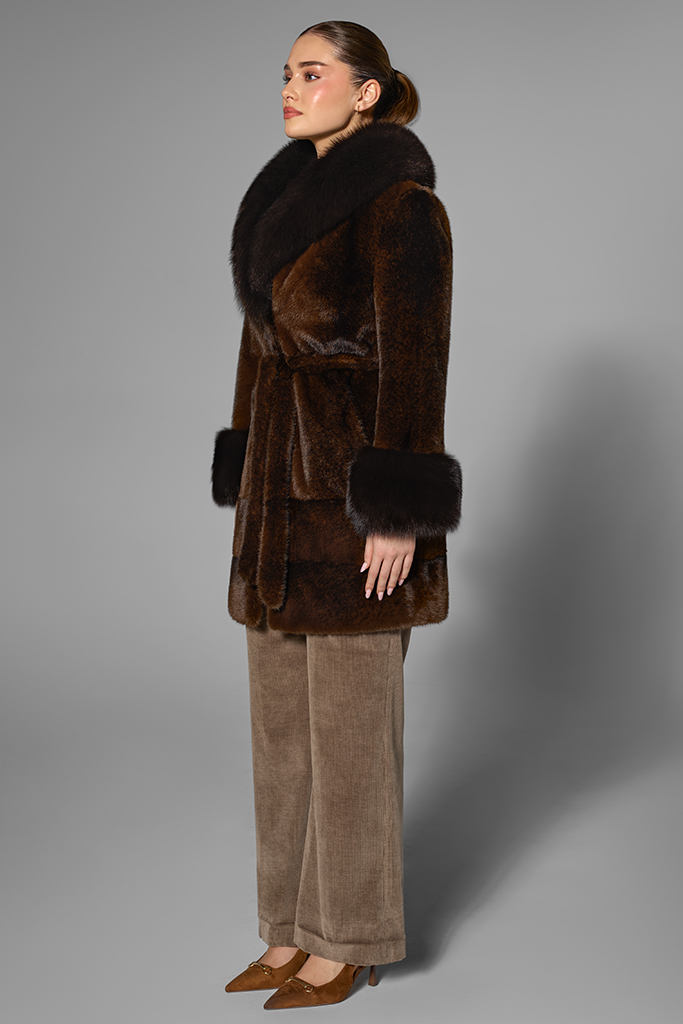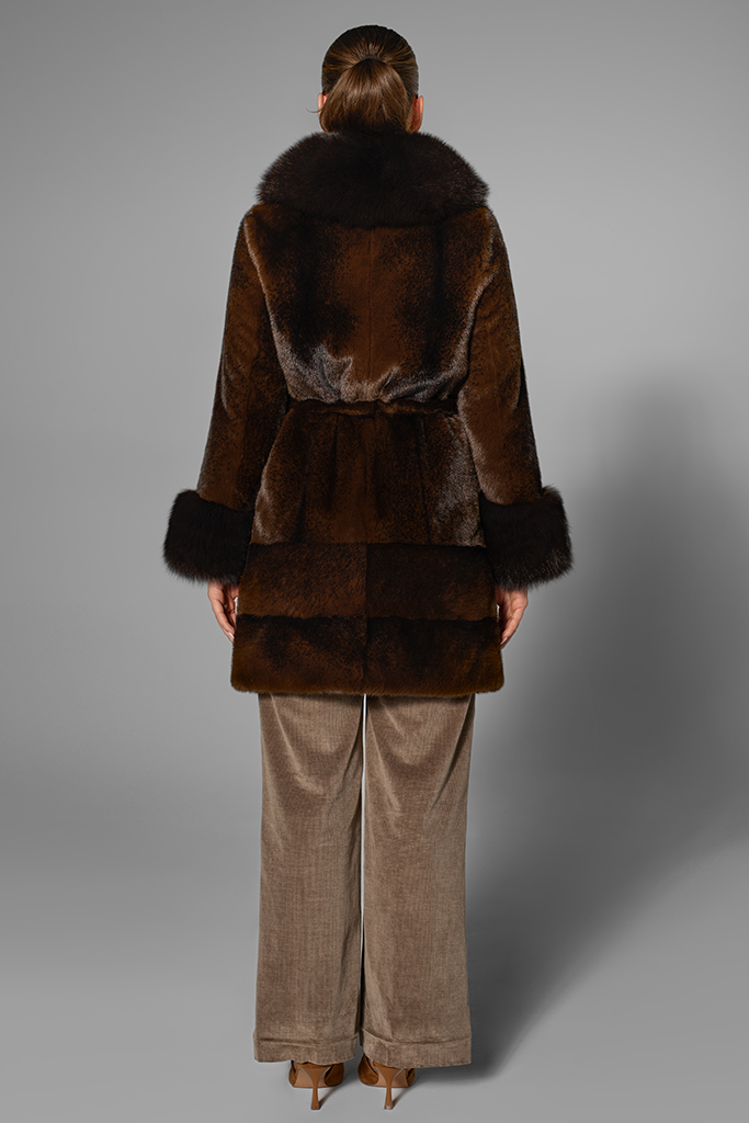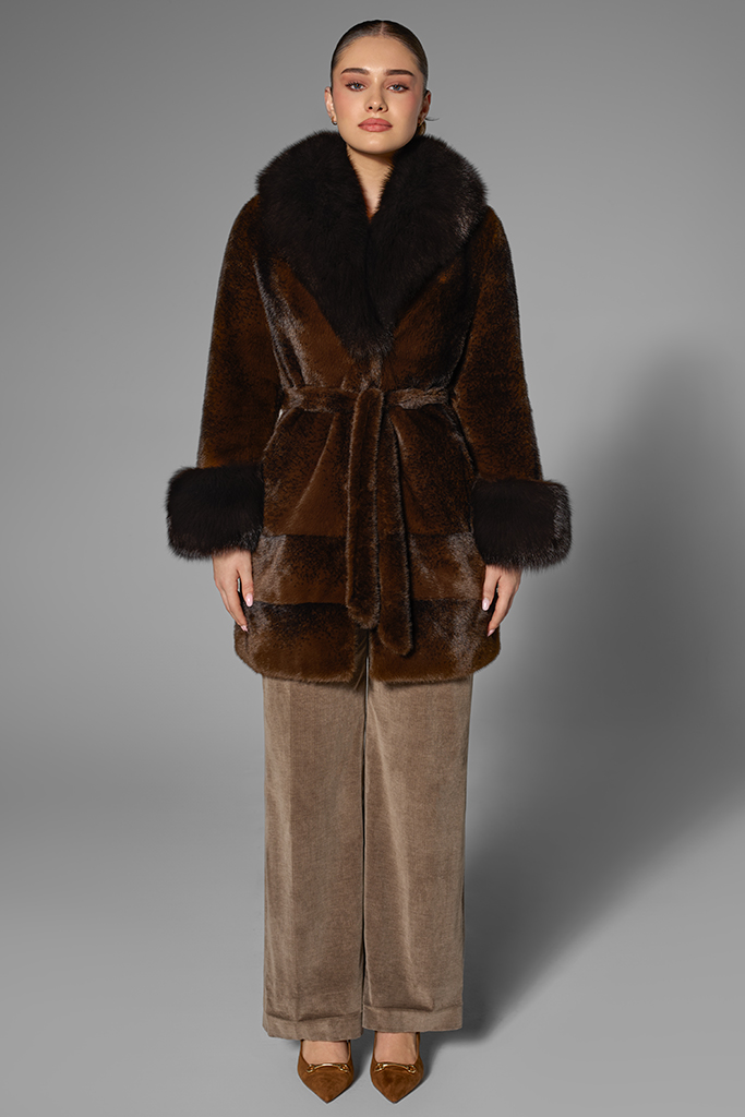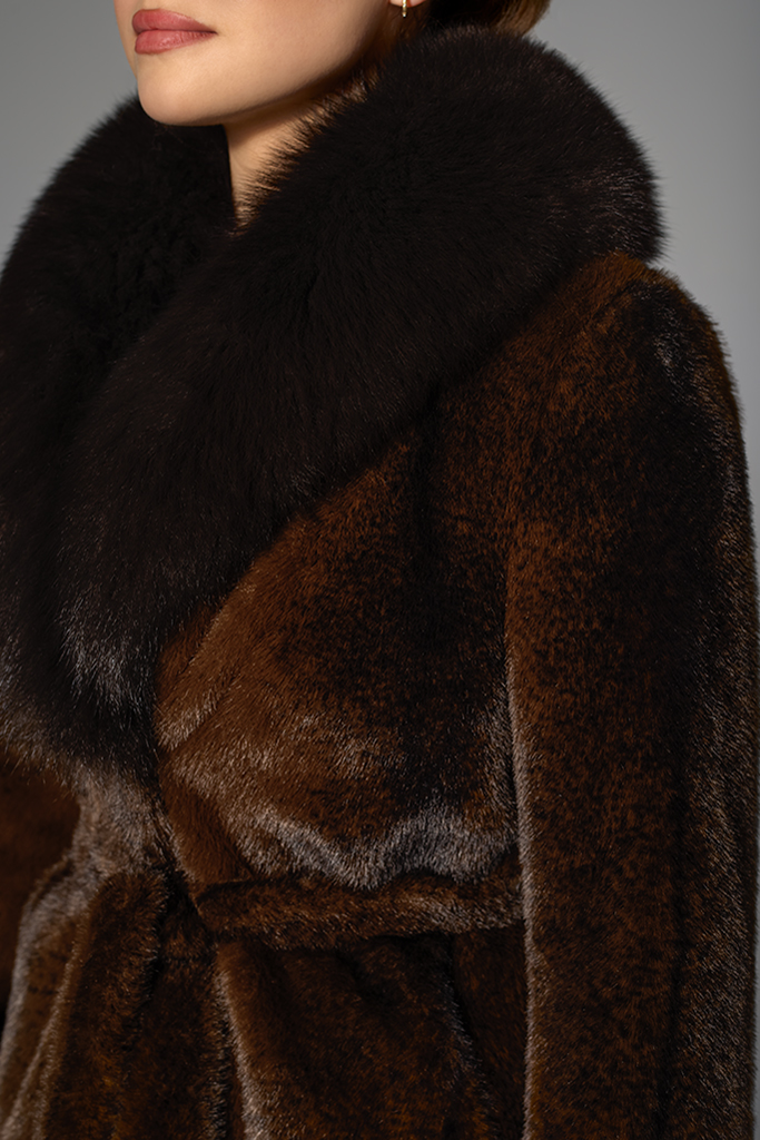 Palton din alcantara cu blana naturala de vulpe samur, cu cordon, Chocolate, Carolina Design