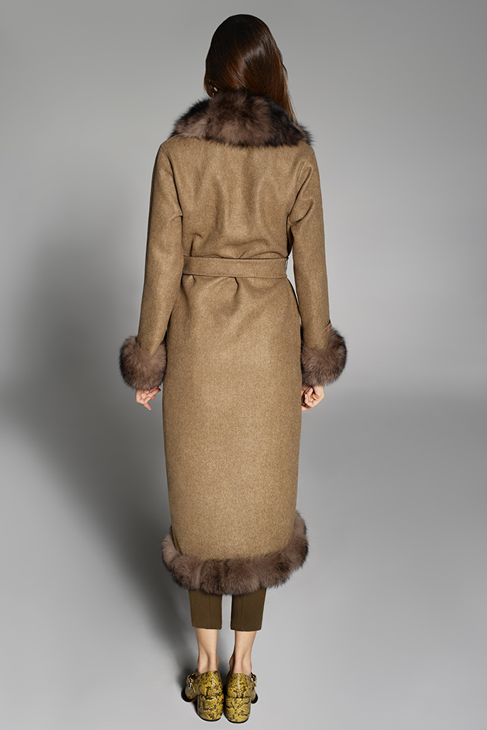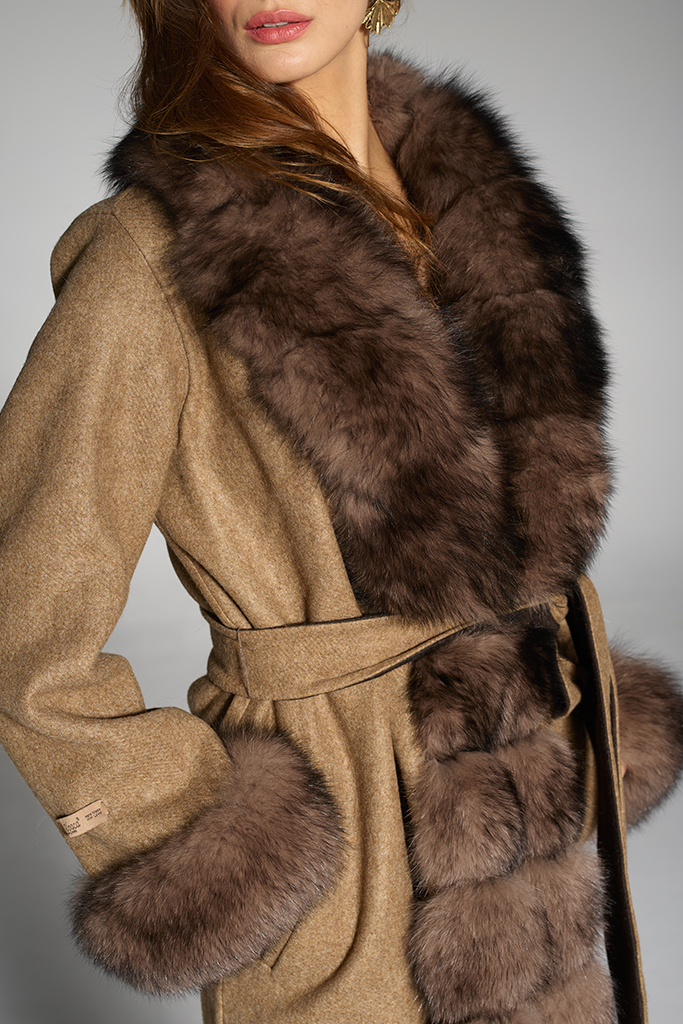 Palton din Lana de Alpaca cu blana naturala de Vulpe Samur , cu cordon si nasturi , Bej , Carolina Design