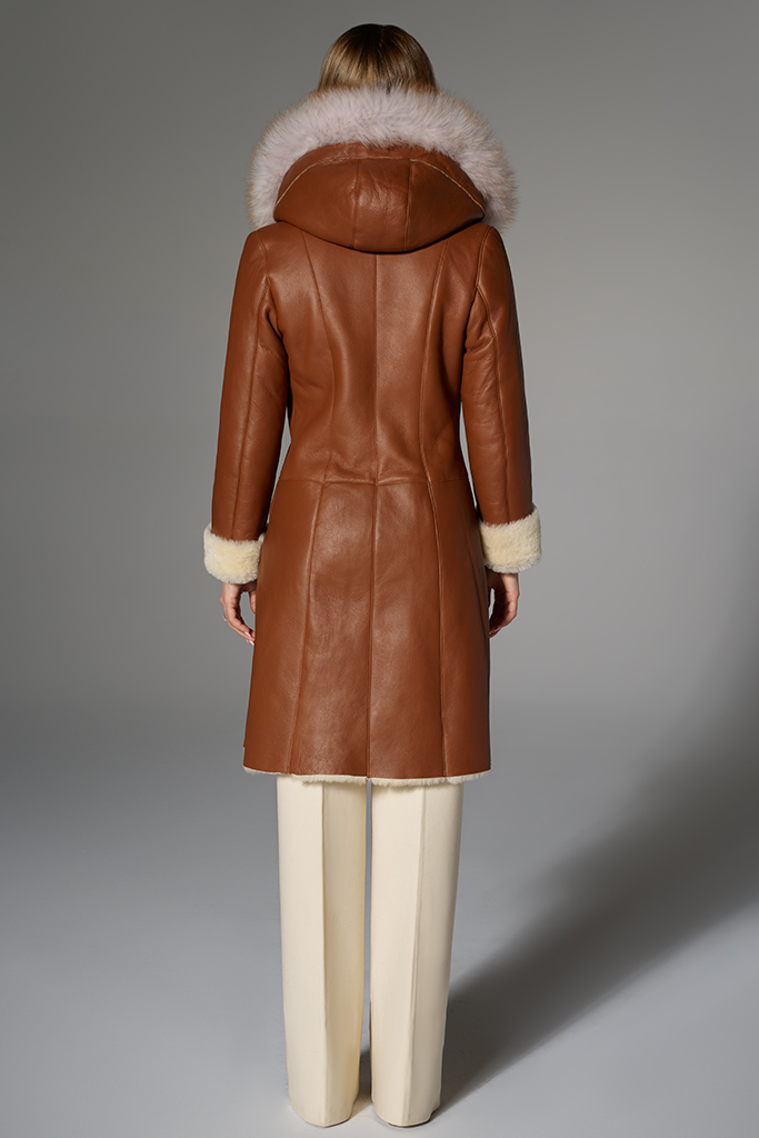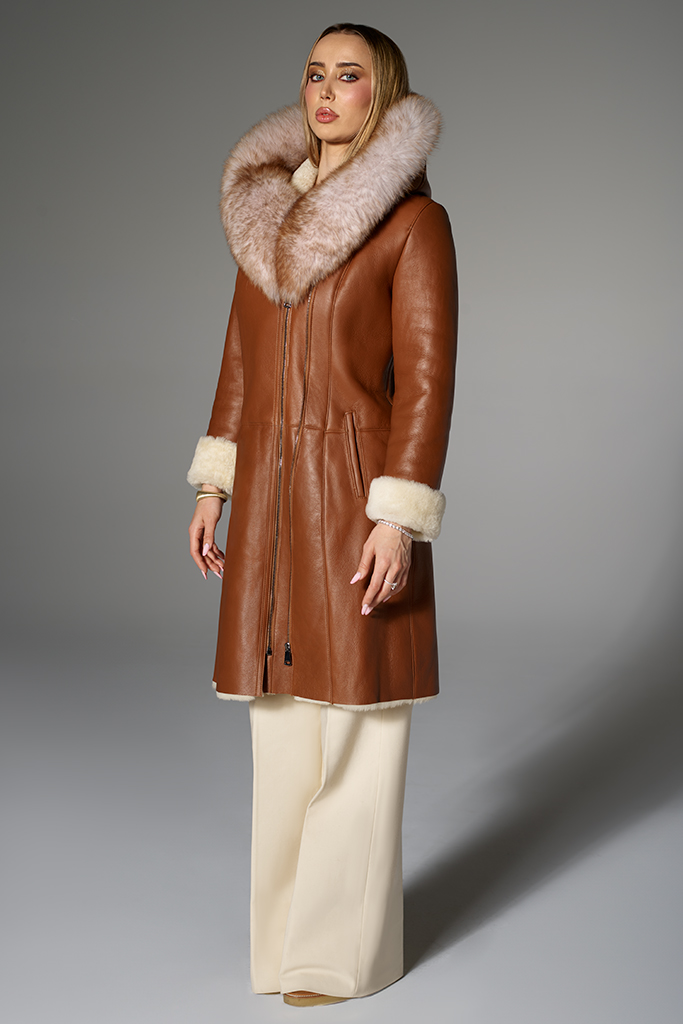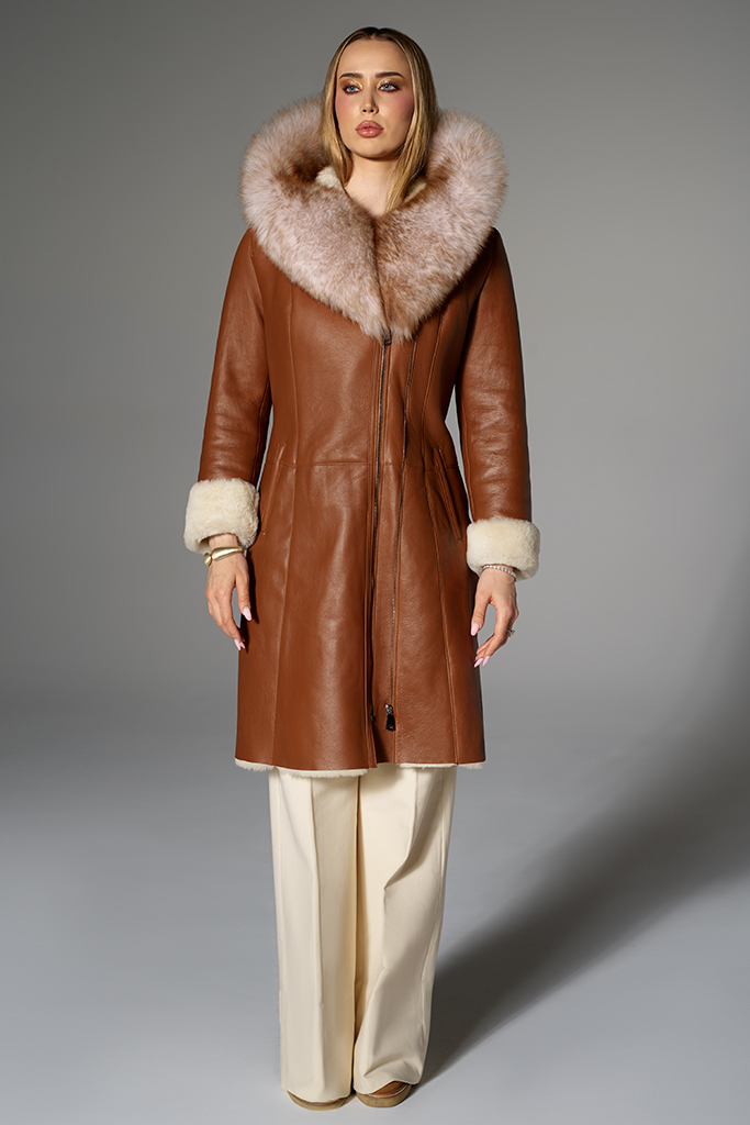 O piesă rafinată și sofisticată, acest palton combină finețea mielului merinos spaniol cu luxul blănii naturale de vulpe polară în nuanța caramel, oferind un look elegant și o prezență distinctă, potrivită pentru apariții memorabile.