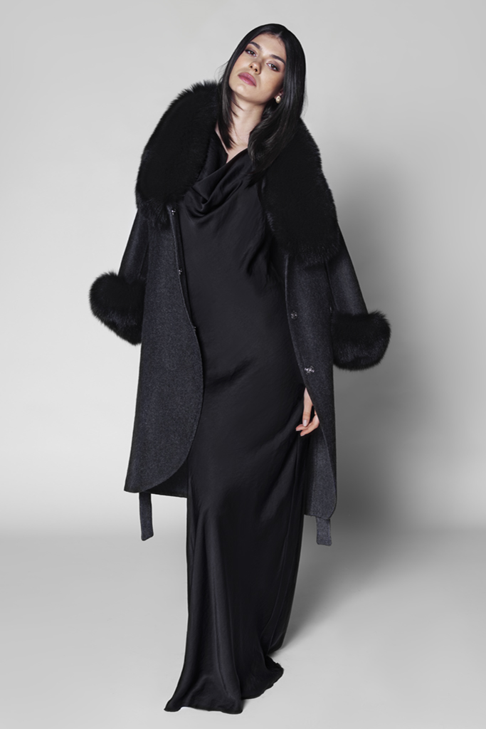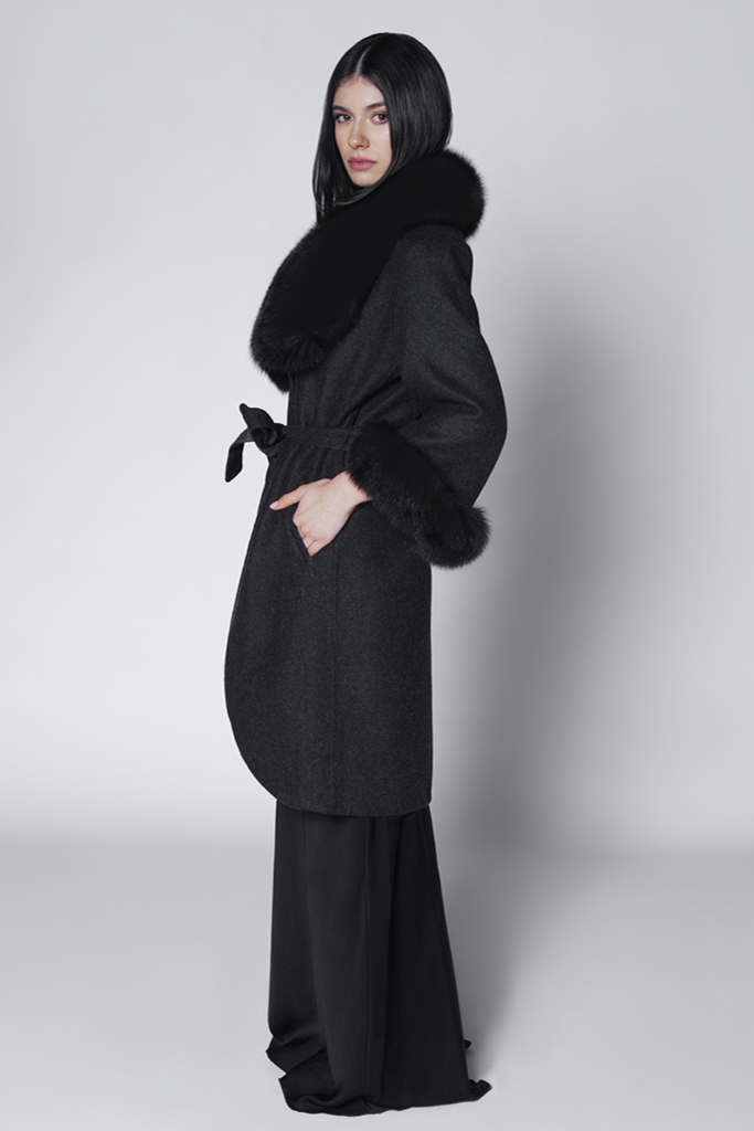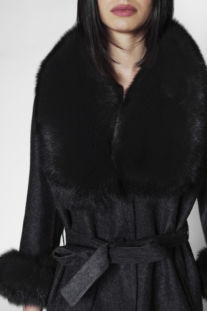 Palton din Lana de Alpaca cu blana naturala de Vulpe Polara , cu cordon si capse , ALPAKA.ON , Negru , Carolina Design