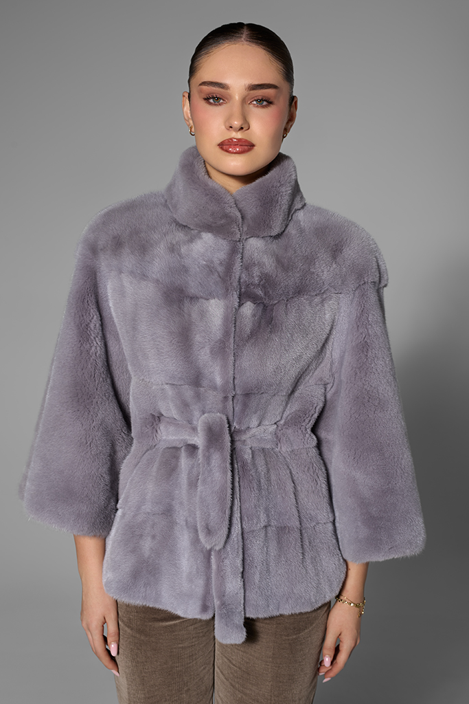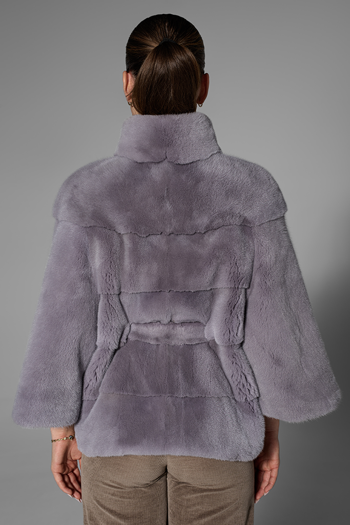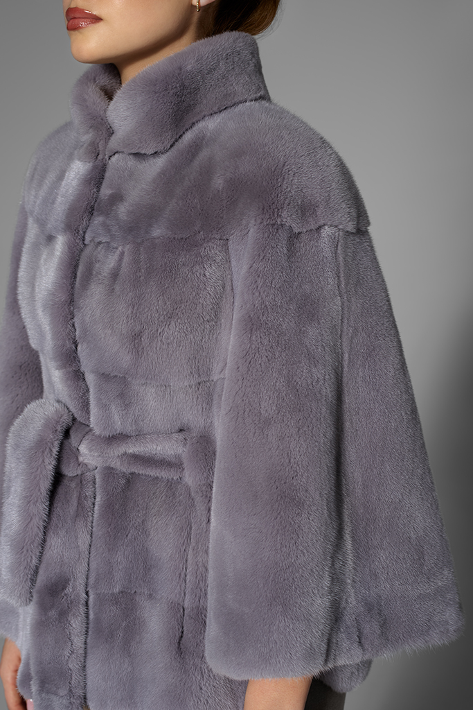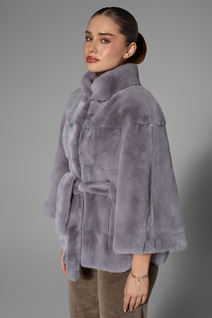 Acest poncho din vizon natural, în nuanța rafinată Lila, combină croiala liberă și aerisită cu luxul autentic al vizonului.
