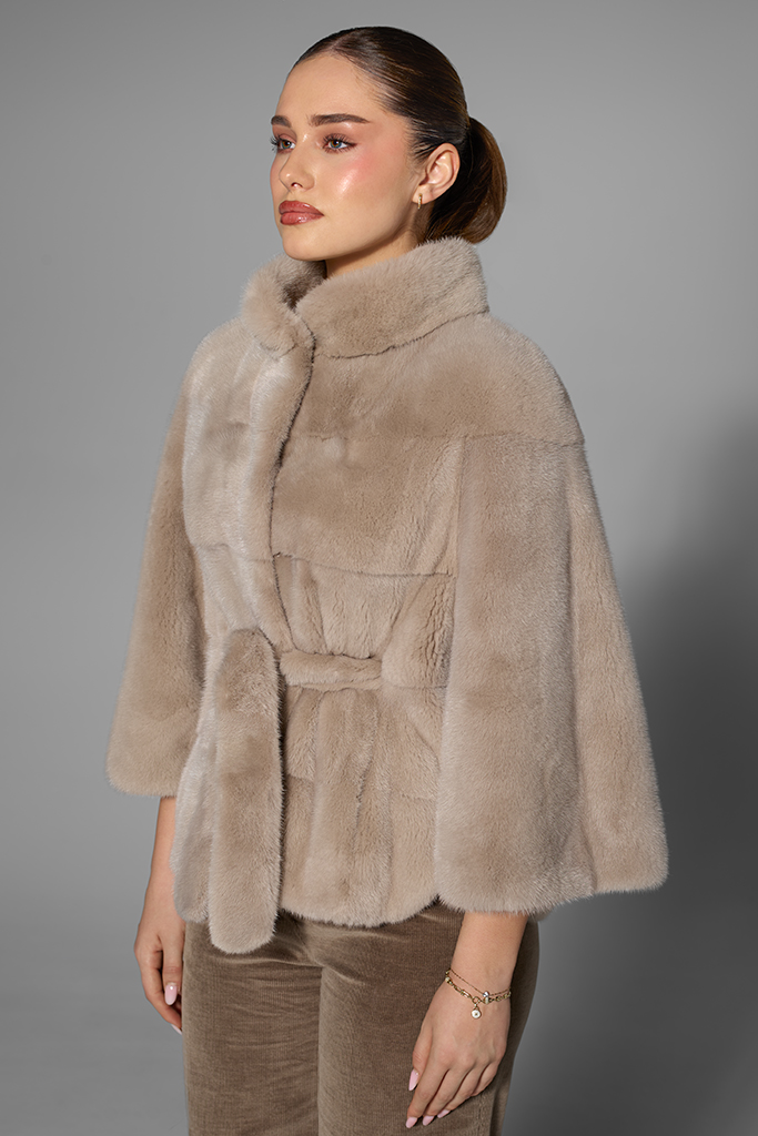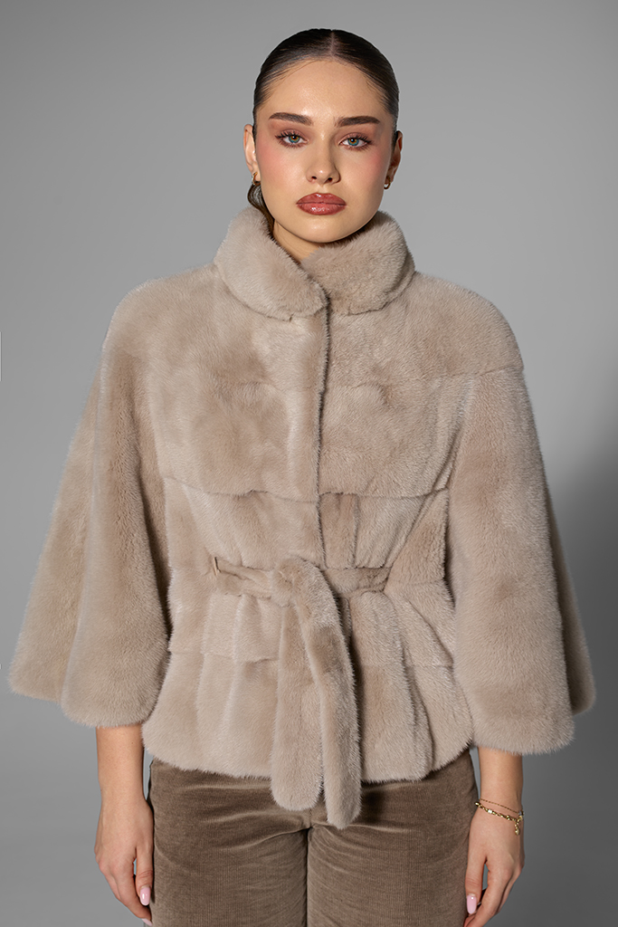Poncho-ul Mocha este confecționat din blană naturală de vizon (nurcă), cu o croială amplă și fluidă, ce oferă libertate de mișcare și un aer relaxat, păstrând totodată luxul autentic al materialului. Blana fină și mătăsoasă asigură senzația de confort și delicatețe la fiecare purtare, în timp ce cordonul din talie permite conturarea subtilă a siluetei, adăugând o notă rafinată și feminină.