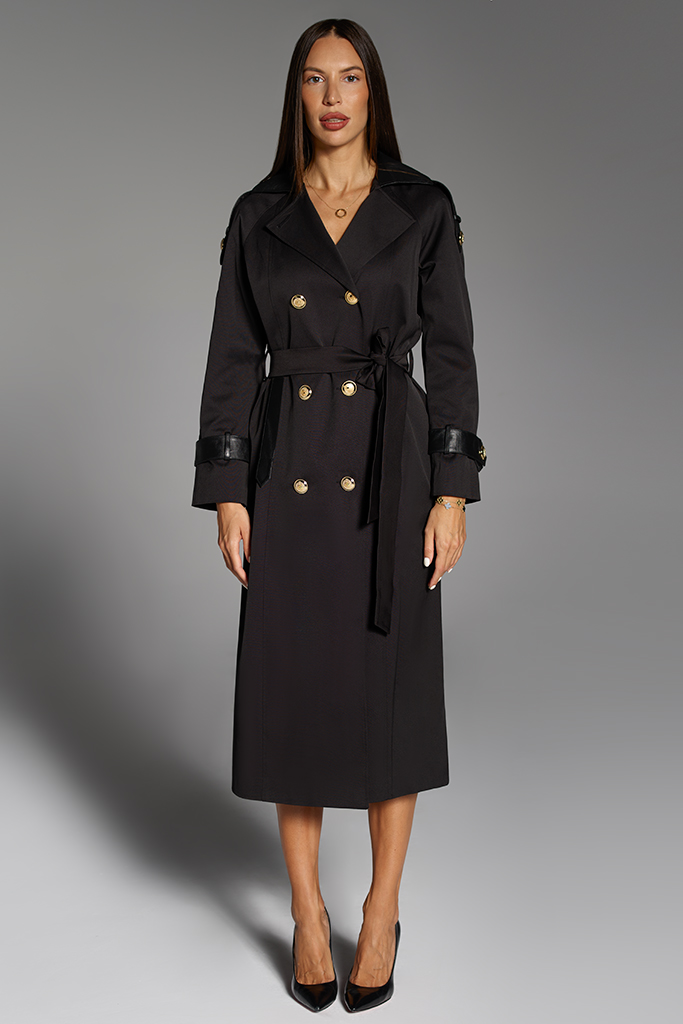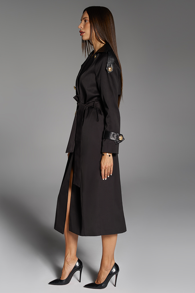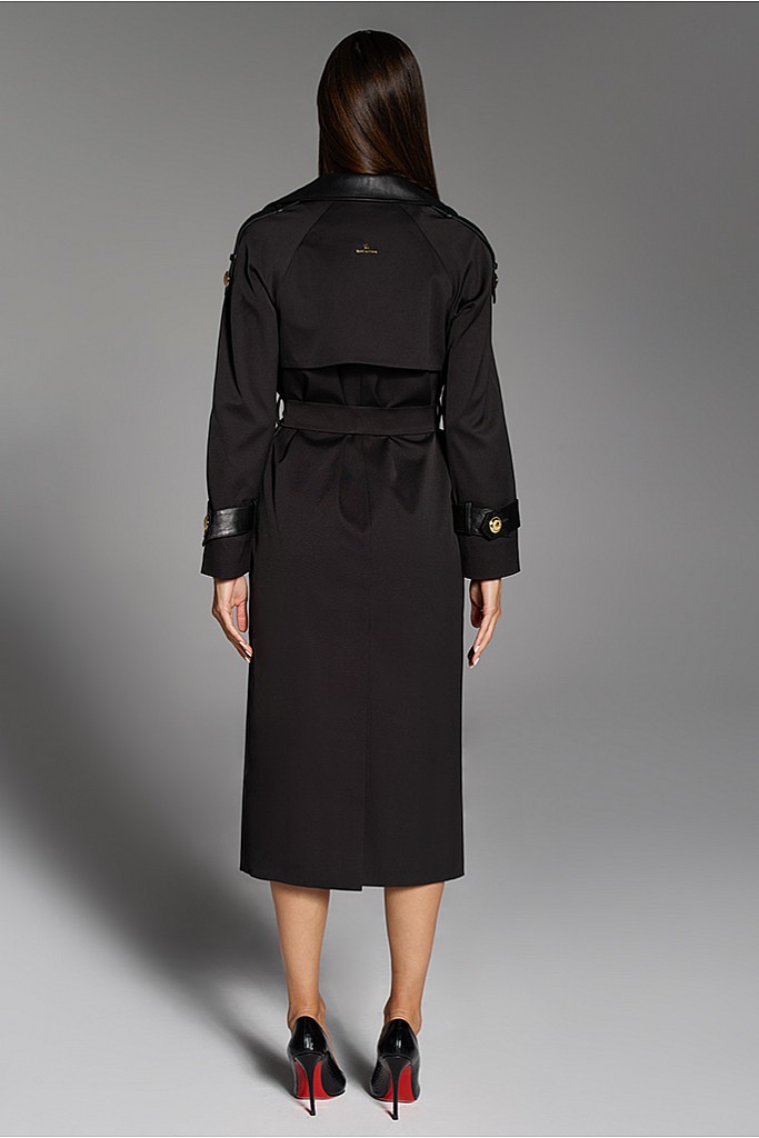 Trenci textil cu mansete si epoleti din piele naturala, Negru, Noemi, Carolina Design